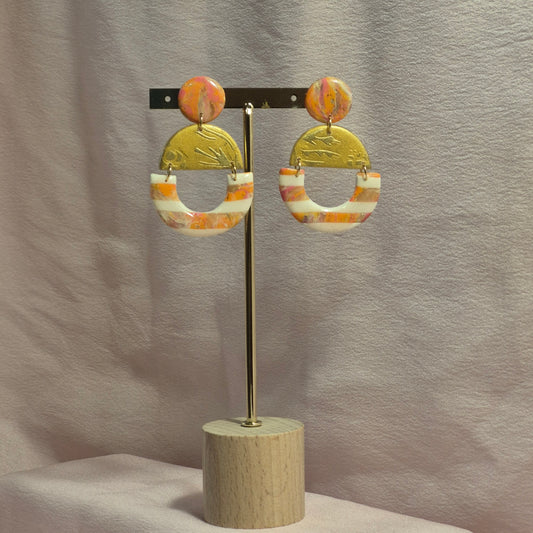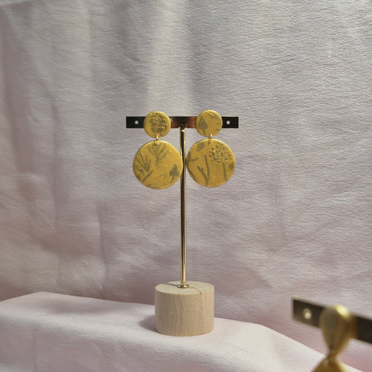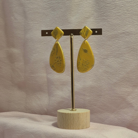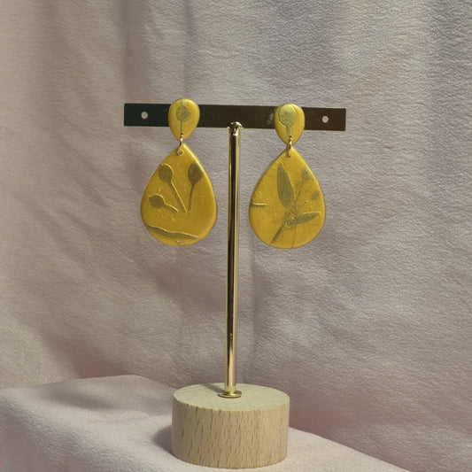 Inspirada en la belleza natural y la delicadeza de las plantas silvestres, la colección "Raíces Doradas" presenta una serie de aretes hechos a mano con arcilla polimérica en tono mostaza suave, cada uno con detalles en relieve botánico que evocan flores, ramas y hojas. Algunos diseños se combinan con piezas marmoleadas en tonos cálidos como coral, blanco y naranja, aportando un contraste encantador.