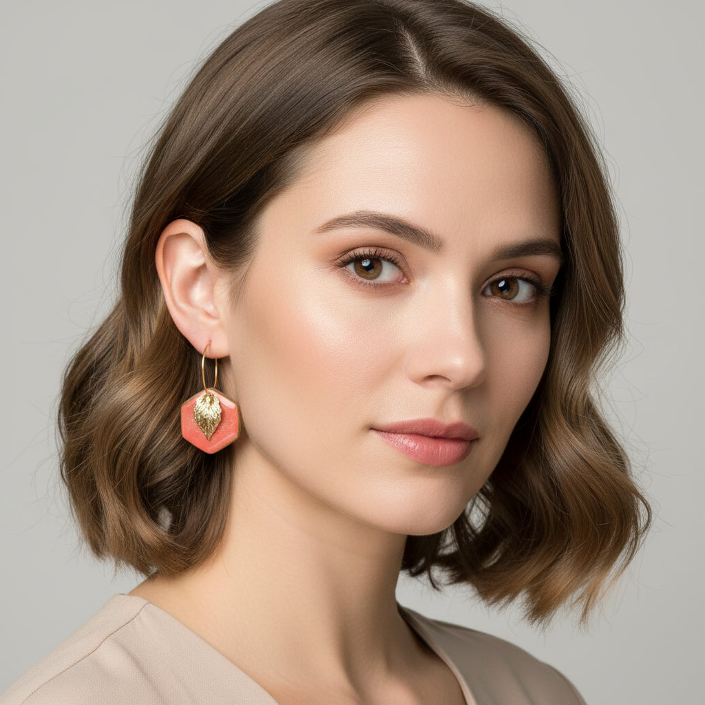 Pendientes hechos a mano en arcilla polimérica de color coral, con forma hexagonal y un delicado charm metálico en forma de hoja dorada en el centro. Montados en aros de acero inoxidable dorado, resistentes e hipoalergénicos.