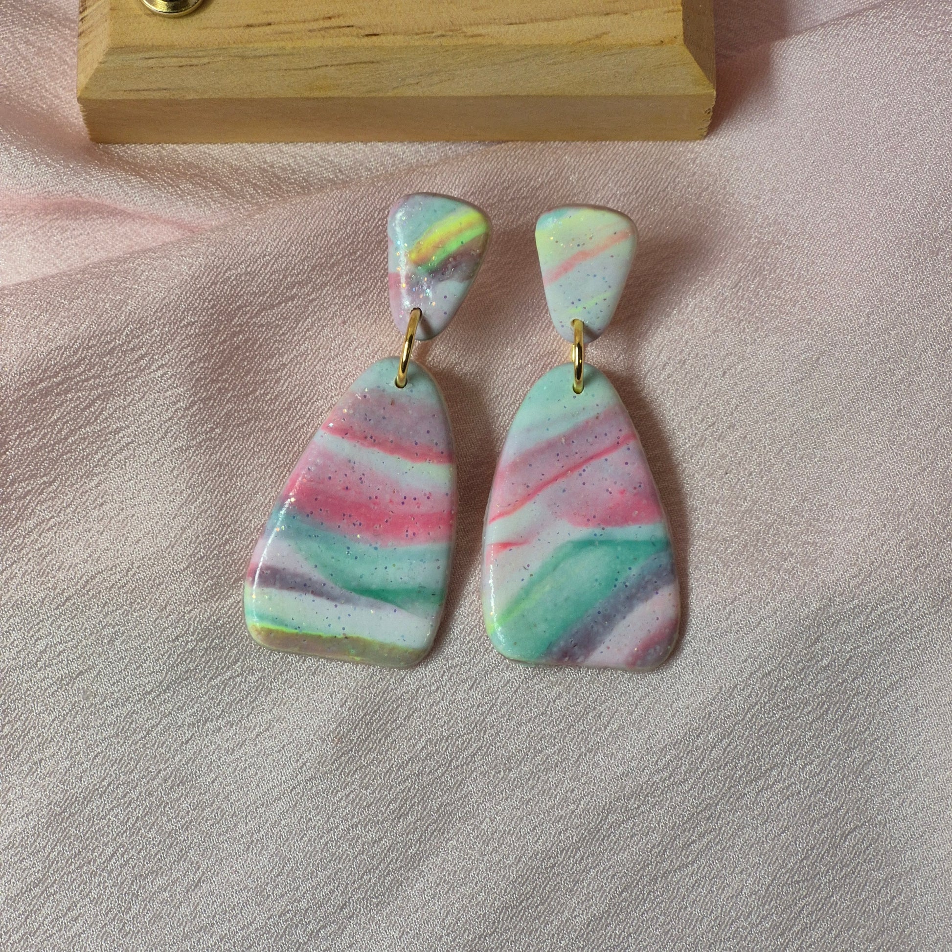 Pendientes colgantes hechos a mano con arcilla polimérica en tonos pastel marmoleados. Sus formas orgánicas y curvas suaves evocan la delicadeza de una aurora al amanecer, con pinceladas de rosa, verde, lavanda y un toque de brillo sutil. Livianos y cómodos, con herrajes de latón dorado, son el complemento perfecto para un look dulce, artístico y lleno de luz.
