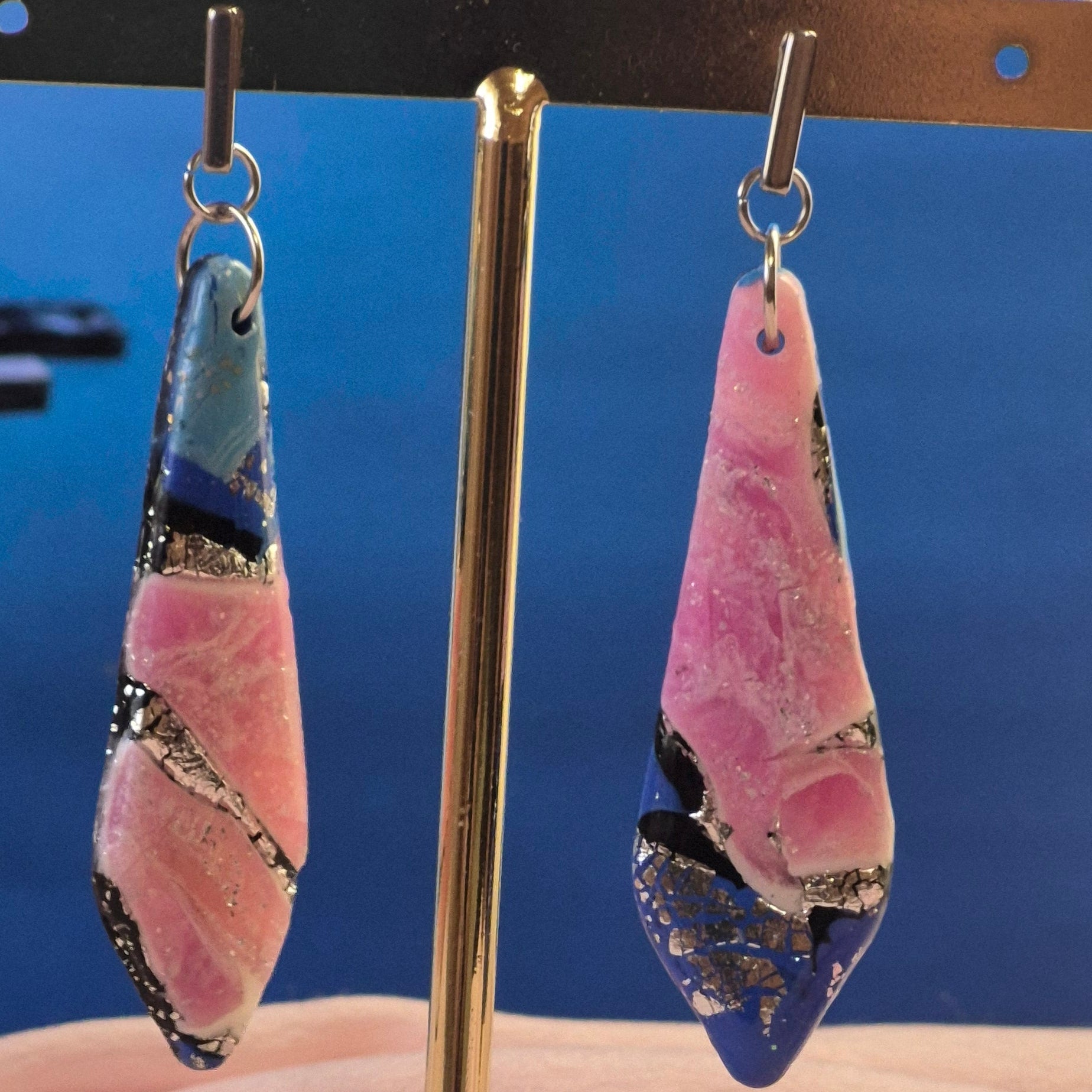 Explosión de color y brillo en cada movimiento. Hechos a mano en arcilla polimérica con tonos rosa, azul y detalles en negro y plata, creando un diseño moderno y lleno de energía. Montados en acero inoxidable hipoalergénico, ligeros y cómodos para todo el día.