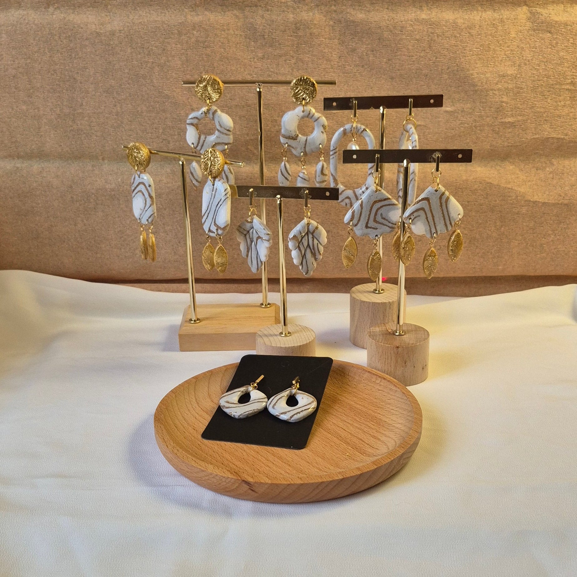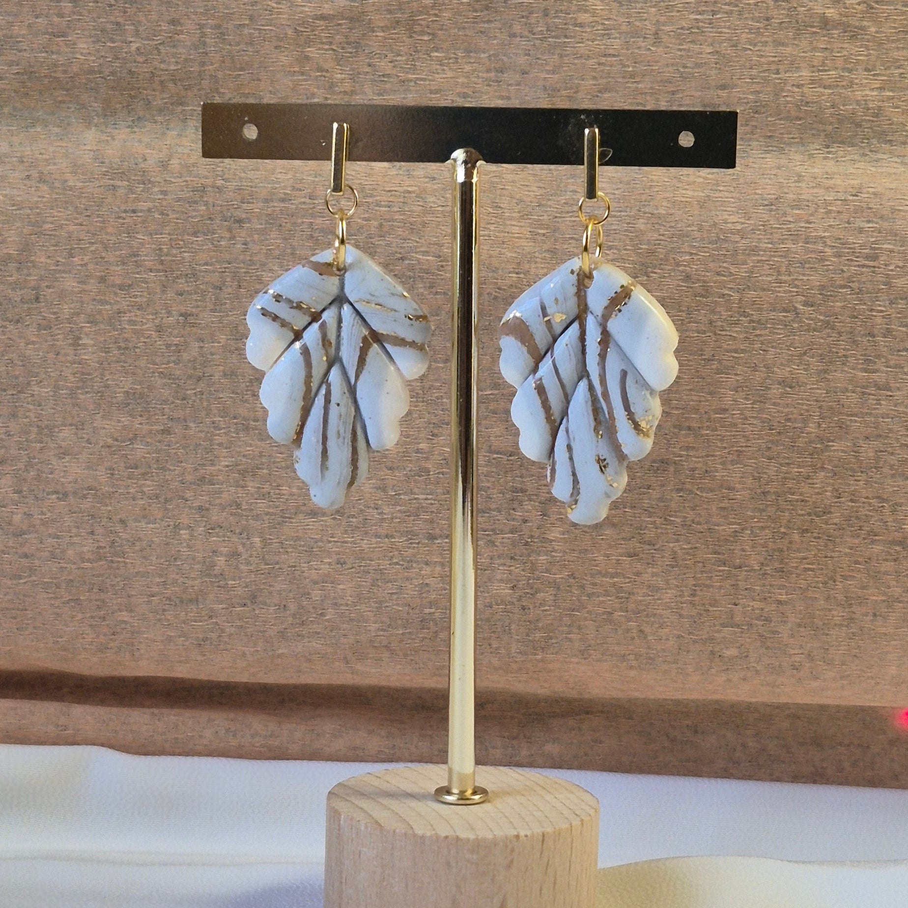 Los pendientes “Hoja Boreal” están elaborados a mano en arcilla polimérica, inspirados en la belleza natural de las hojas y su elegancia atemporal. Su tono blanco suave, con delicadas vetas doradas, aporta un estilo fresco y sofisticado que combina con cualquier look.