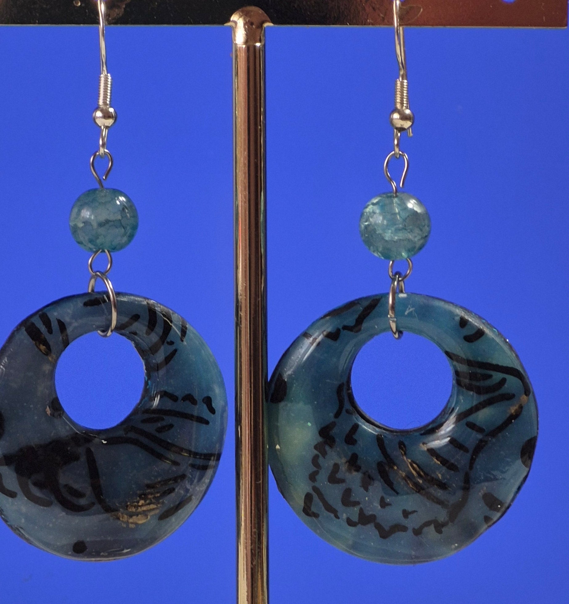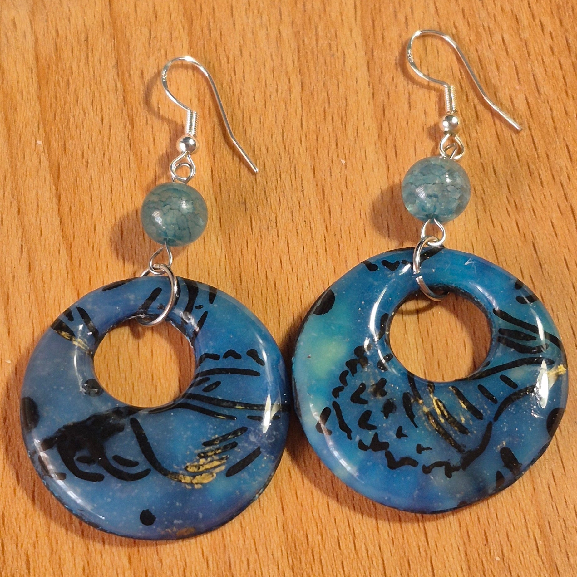 Los pendientes Aguas Profundas evocan la serenidad y el misterio del océano. Hechos a mano en arcilla polimérica, presentan un acabado brillante en tonos azul zafiro y turquesa, con delicados detalles en negro y dorado que recuerdan las corrientes marinas.
