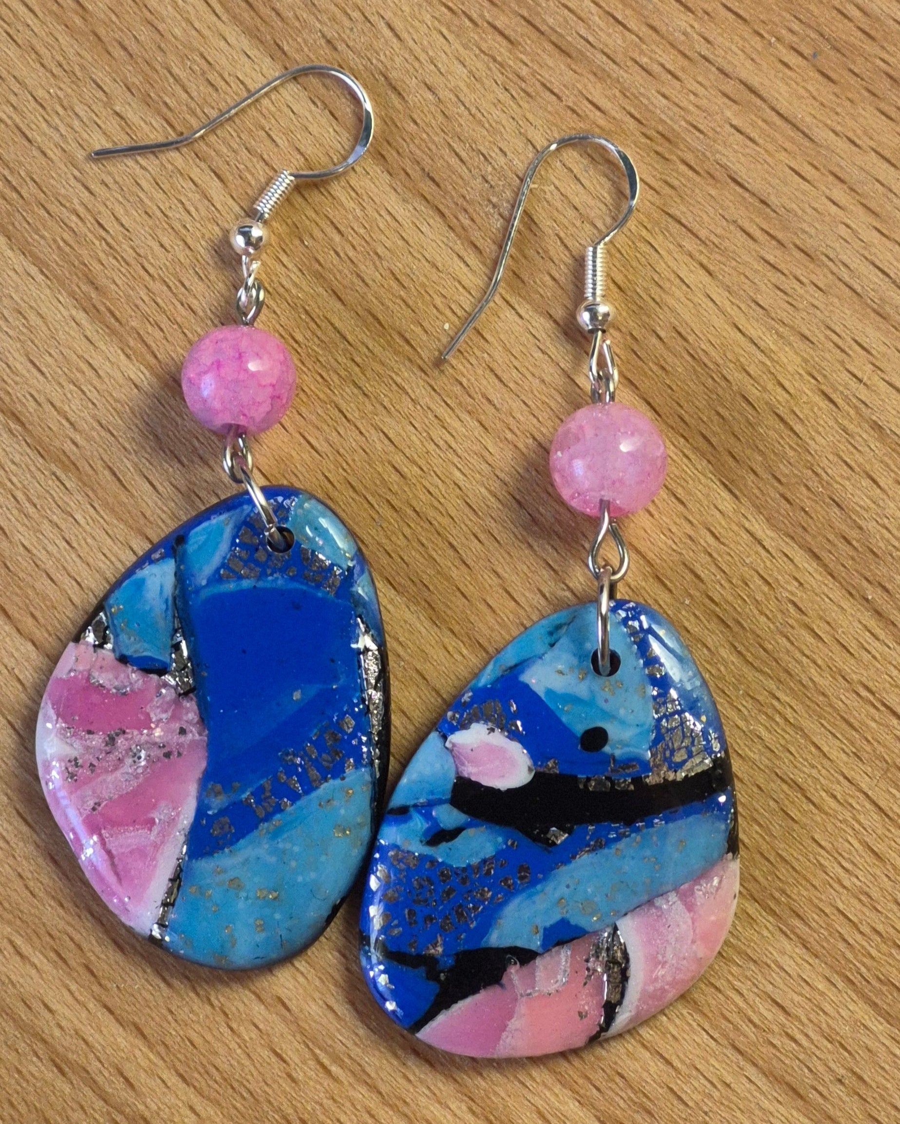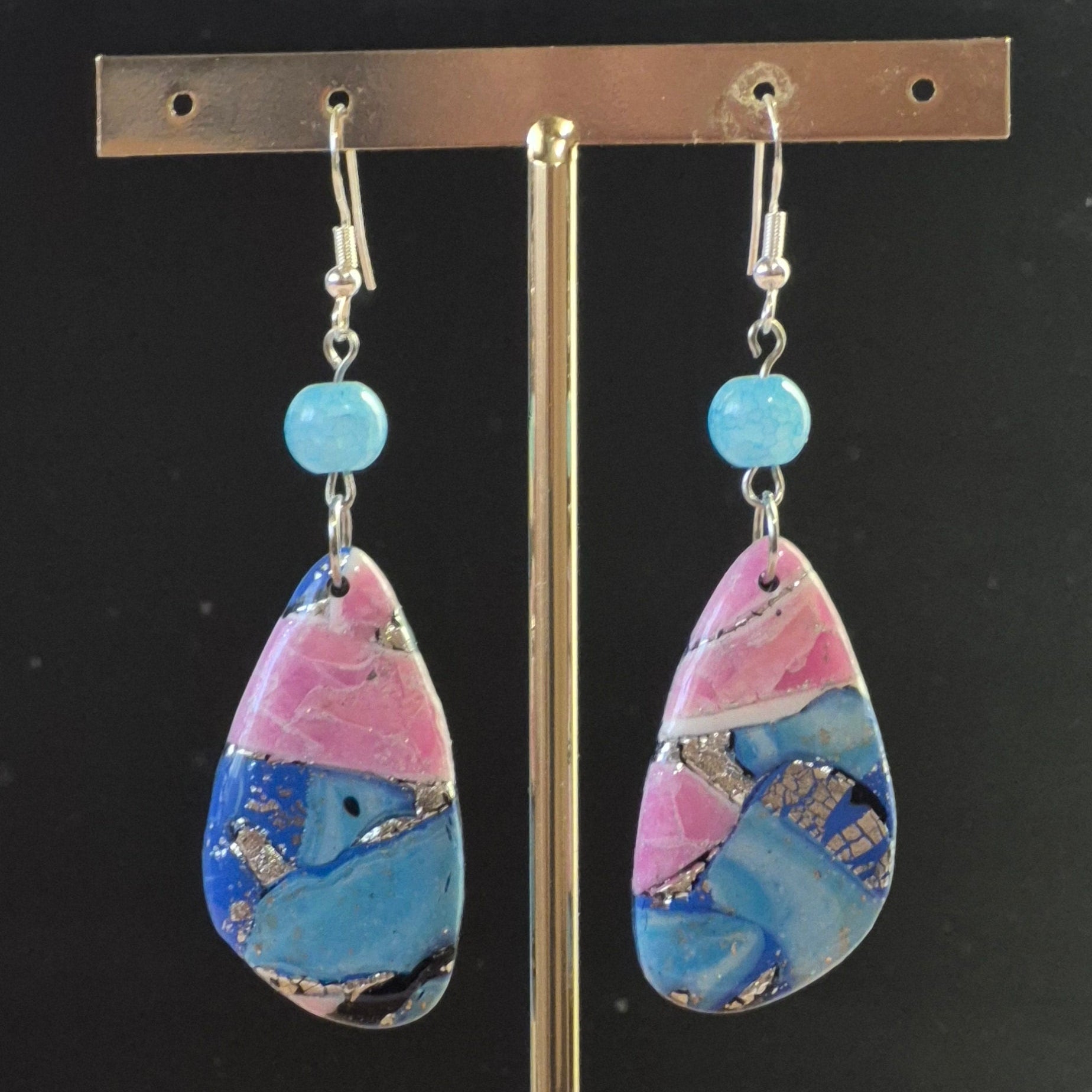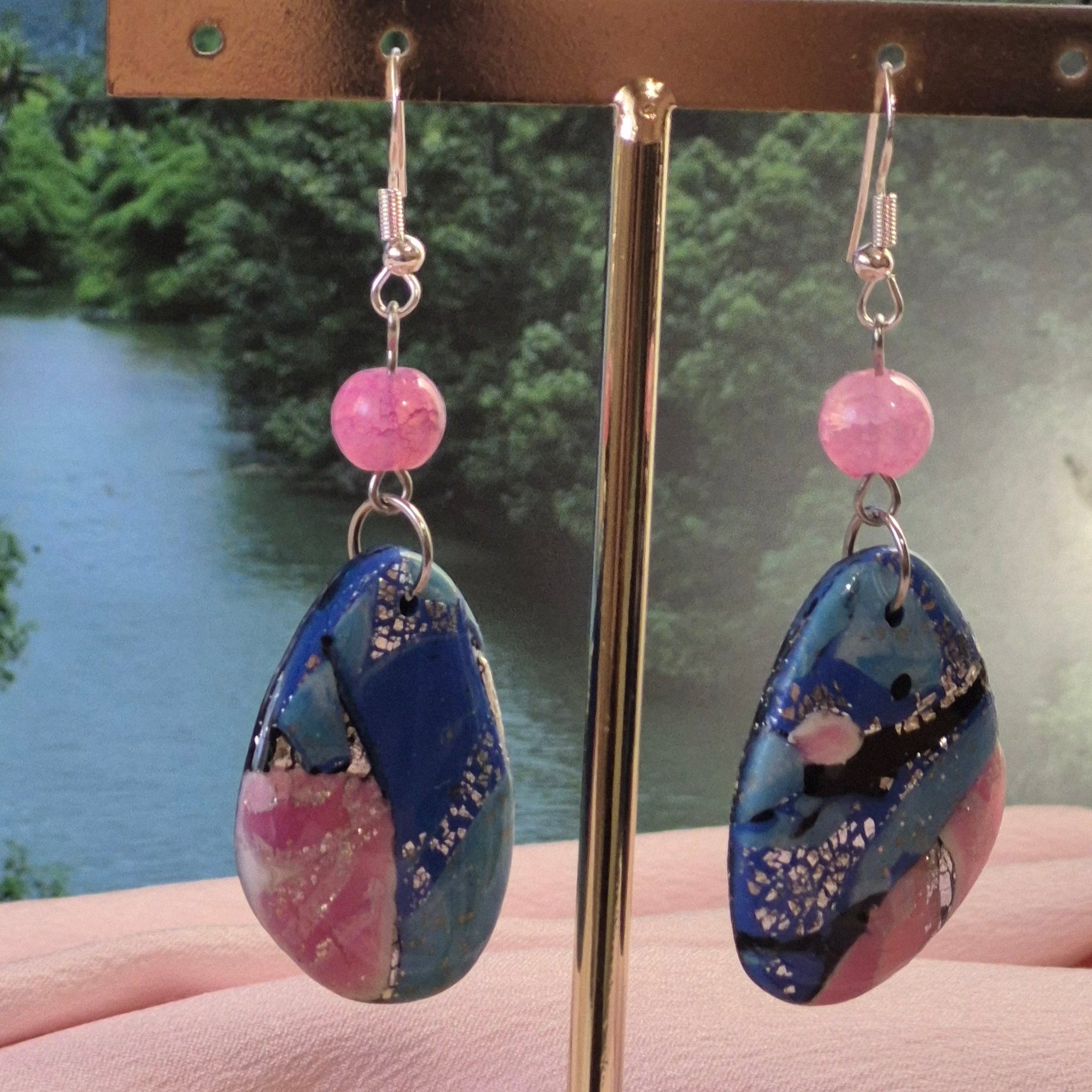 Pendientes artesanales en forma de lágrima elaborados en arcilla polimérica con vibrantes tonos rosa y azul, realzados con destellos plateados y negros que aportan profundidad al diseño. Incorporan una perla de cristal facetada que capta la luz con cada movimiento y ganchos de plata de ley 925, ideales para pieles sensibles. Una pieza ligera y única que combina frescura y elegancia.