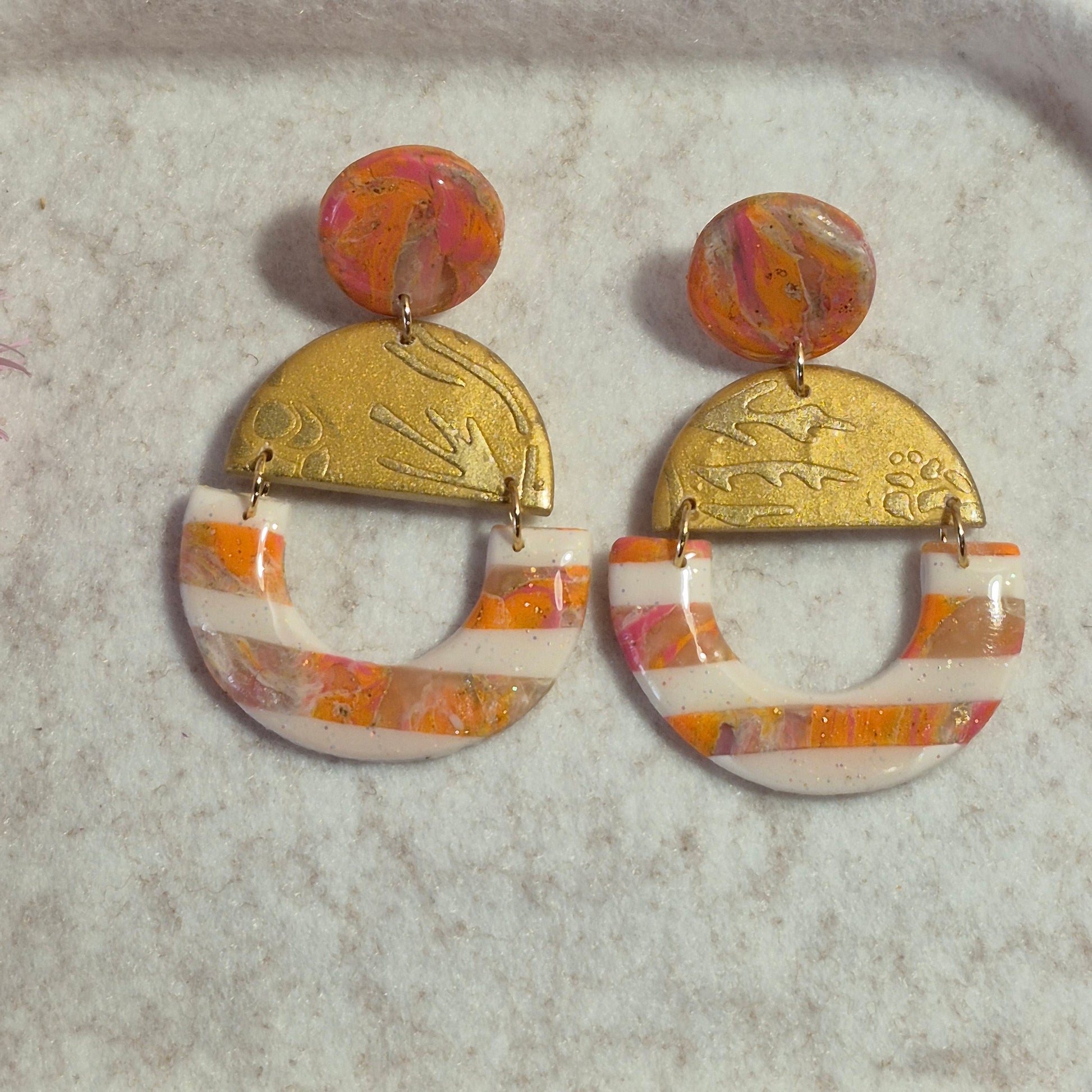 Pendientes hechos a mano con arcilla polimérica y detalles metálicos en dorado. La parte superior circular presenta un diseño marmoleado en tonos cálidos de rosa, naranja y dorado, mientras que el semicírculo de arcilla polimérica tiene grabados con motivos naturales. La pieza inferior en forma de herradura combina rayas en tonos beige, naranja, rosa y blanco, creando una fusión armoniosa de color y textura. Un diseño alegre y luminoso, perfecto para resaltar cualquier look con un toque artístico y sofisticado. 🌅