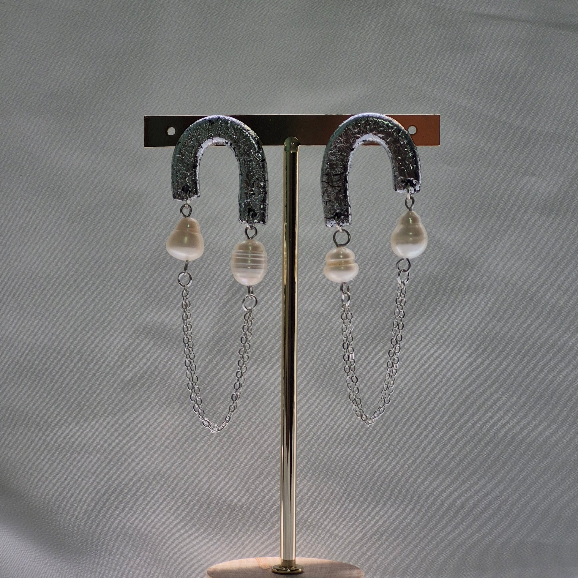 En la parte central, cuelgan dos perlas de agua dulce naturales, cuidadosamente seleccionadas por su forma y suavidad, que aportan un toque de frescura y refinamiento. Además, una cadena doble de metal dorado une cada perla al extremo del pendiente, añadiendo movimiento y un aire moderno al conjunto.