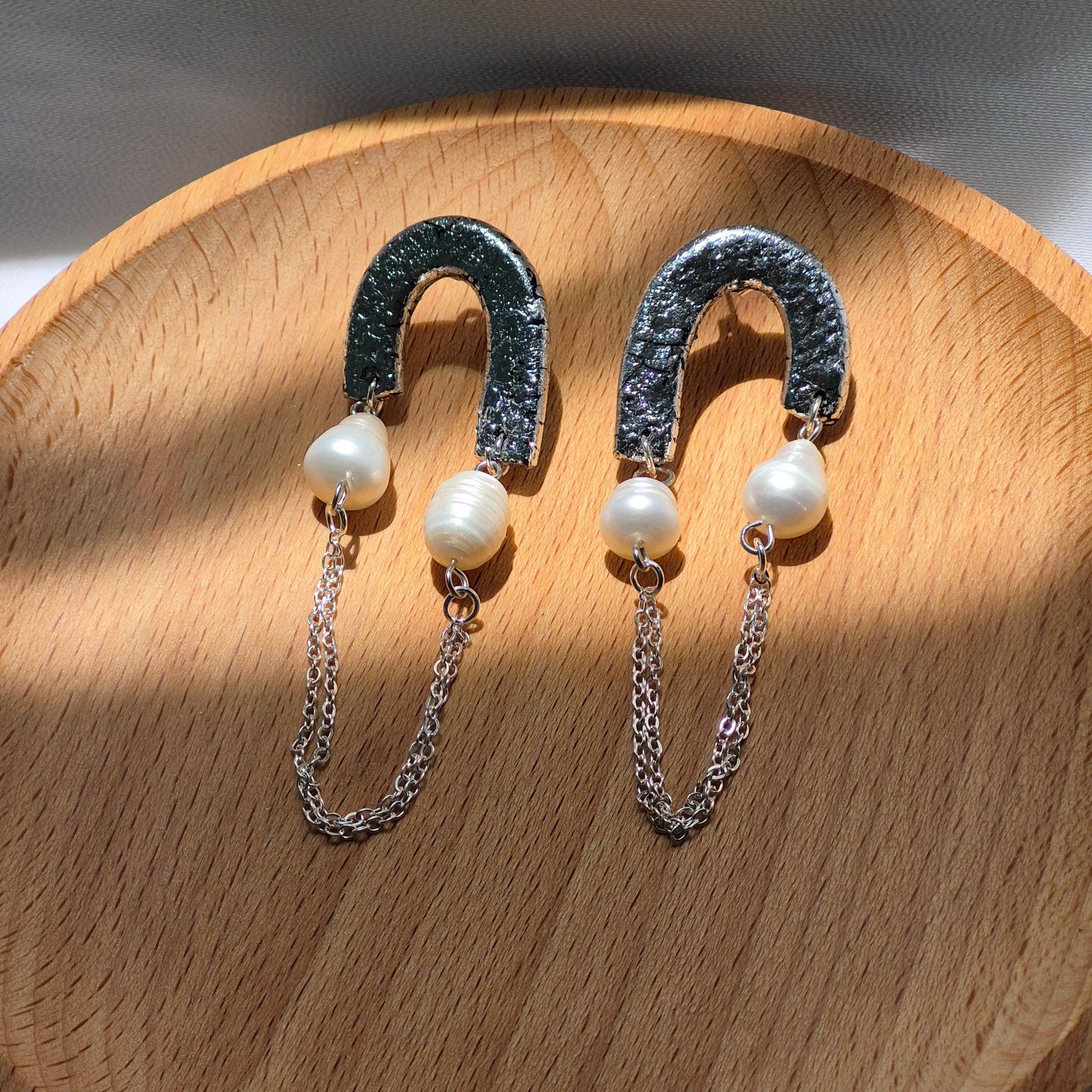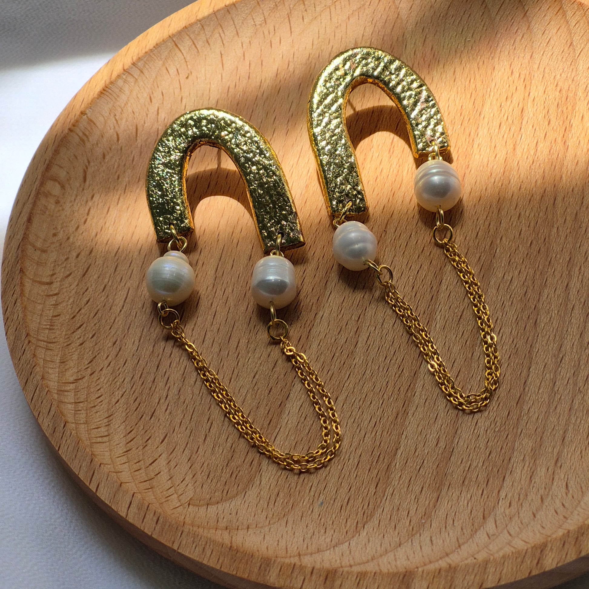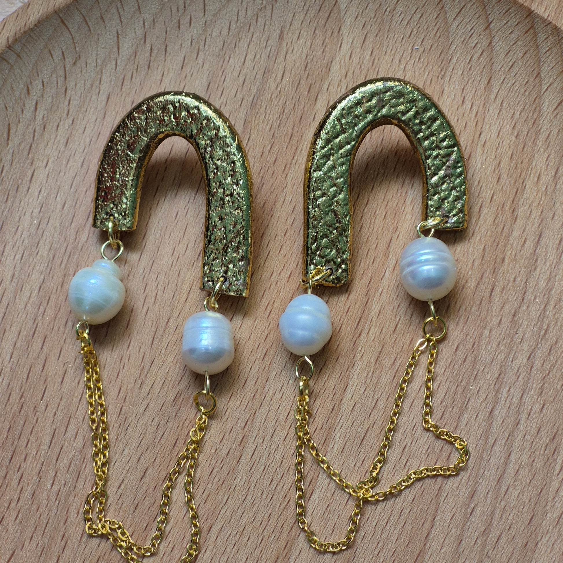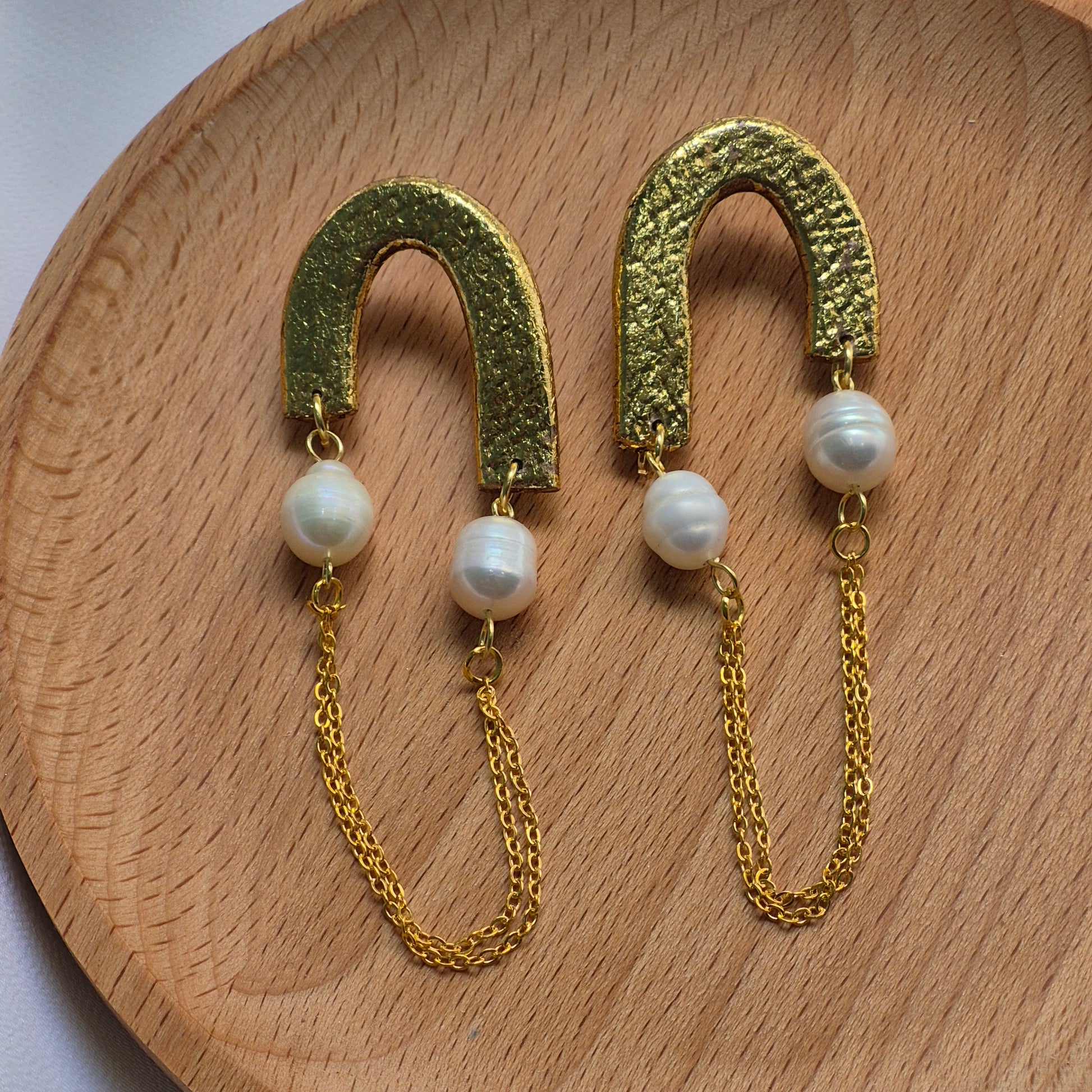 Estoy encantada con estos pendientes. El diseño en forma de arco dorado texturizado les da un estilo único y sofisticado, mientras que las perlas naturales añaden un toque clásico que combina a la perfección. Las cadenitas doradas colgantes aportan movimiento y un aire bohemio muy chic. Se sienten ligeros al usarlos y son ideales tanto para ocasiones especiales como para elevar un look diario. Sin duda, una joya artesanal con mucho estilo. ¡Totalmente recomendados!
