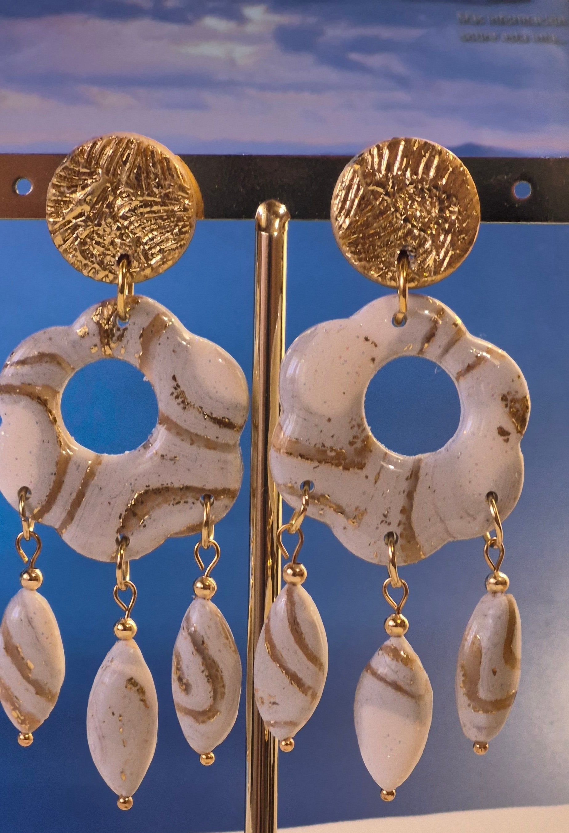 Hechos a mano en arcilla polimérica, su diseño circular calado con colgantes en forma de lágrima combina tonos crema y vetas doradas que evocan la calidez de la arena iluminada por el sol.