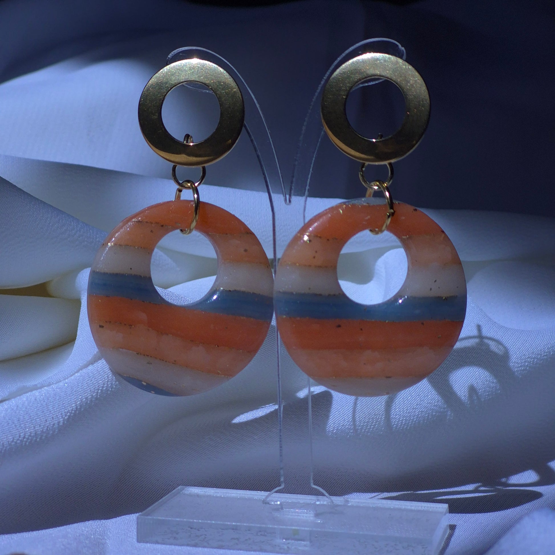 Elegantes y artesanales, estos pendientes están elaborados en arcilla polimérica con un diseño de aros en tonos tierra y azul, evocando la belleza natural. Su enganche de metal hipoalergénico garantiza comodidad y seguridad, ideal para cualquier ocasión. ¡Un accesorio único para realzar tu estilo!
