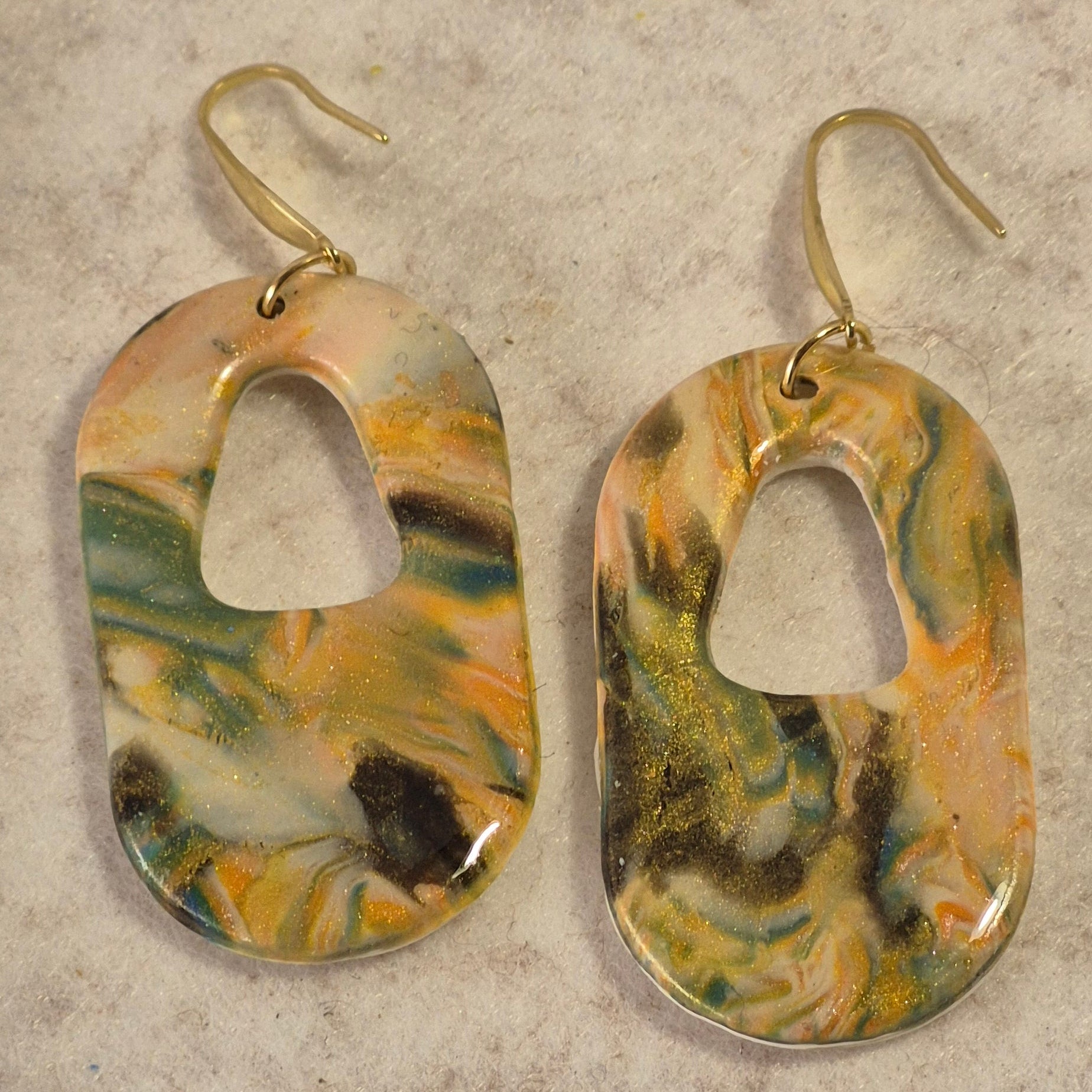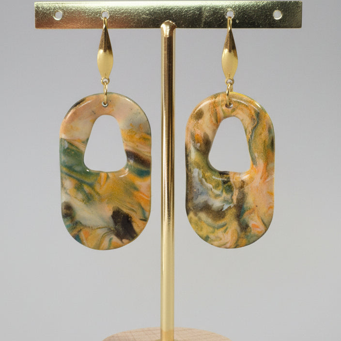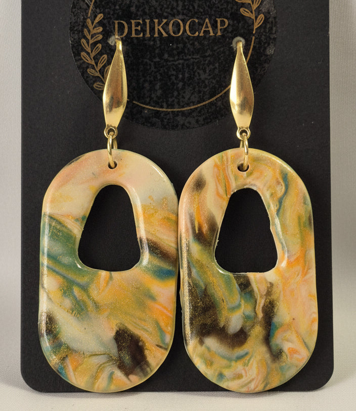 Los Atardecer Marmolado reflejan la fusión perfecta entre arte y naturaleza. Cada pieza está hecha a mano en arcilla polimérica, con un diseño marmolado en tonos dorado, ámbar, verde y azul, que evocan los matices del cielo al caer el sol. 🌇