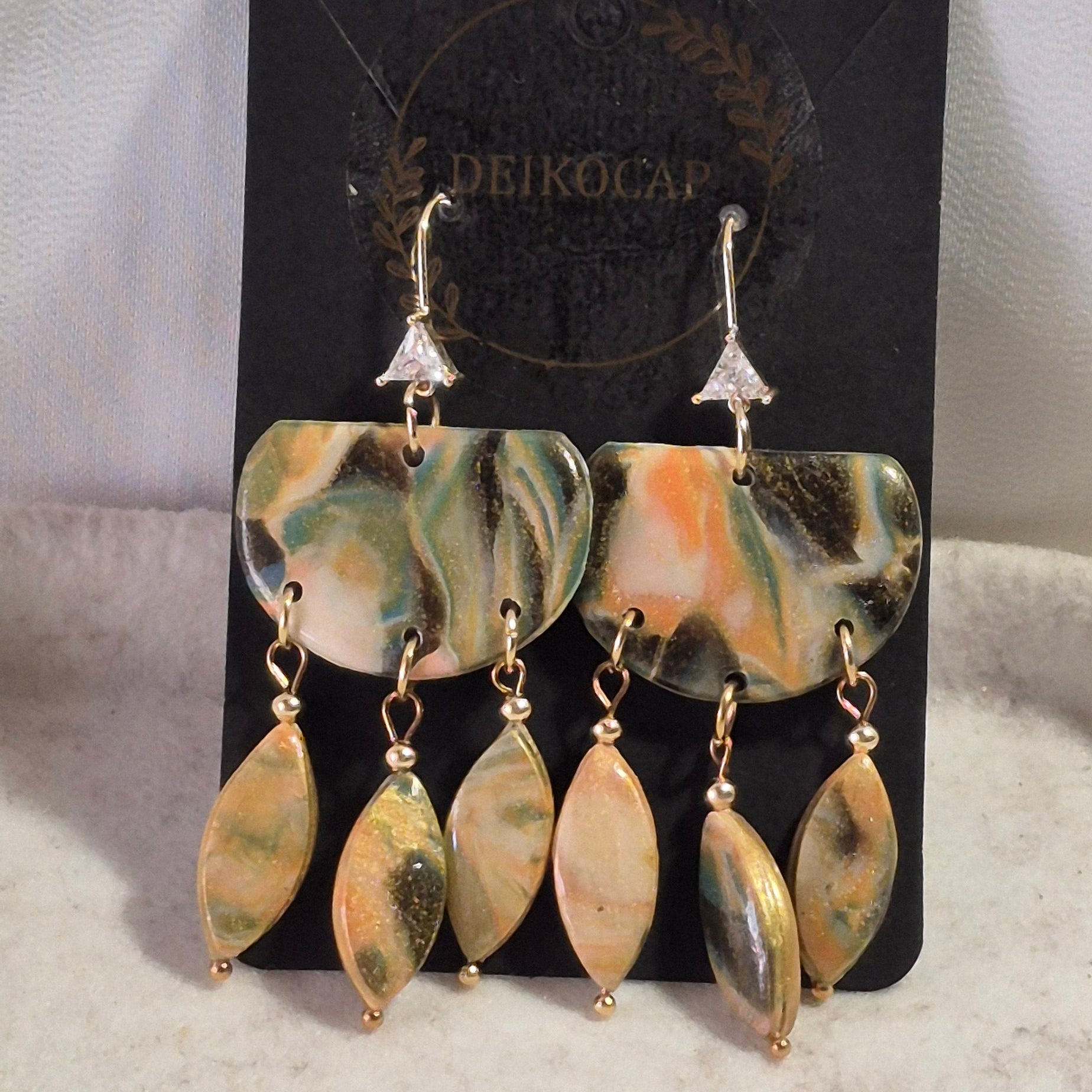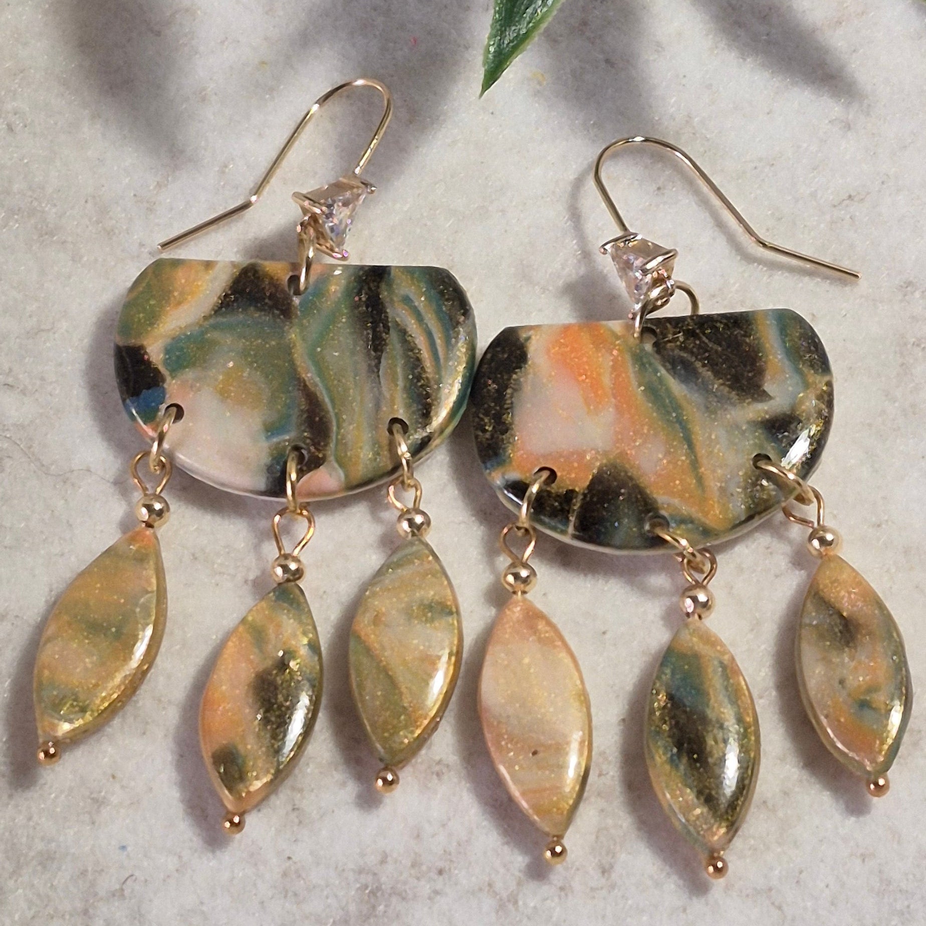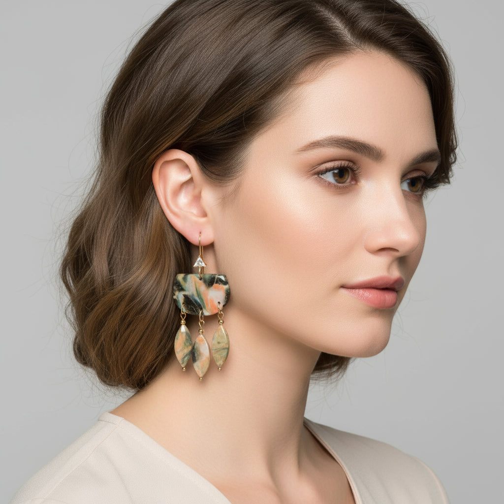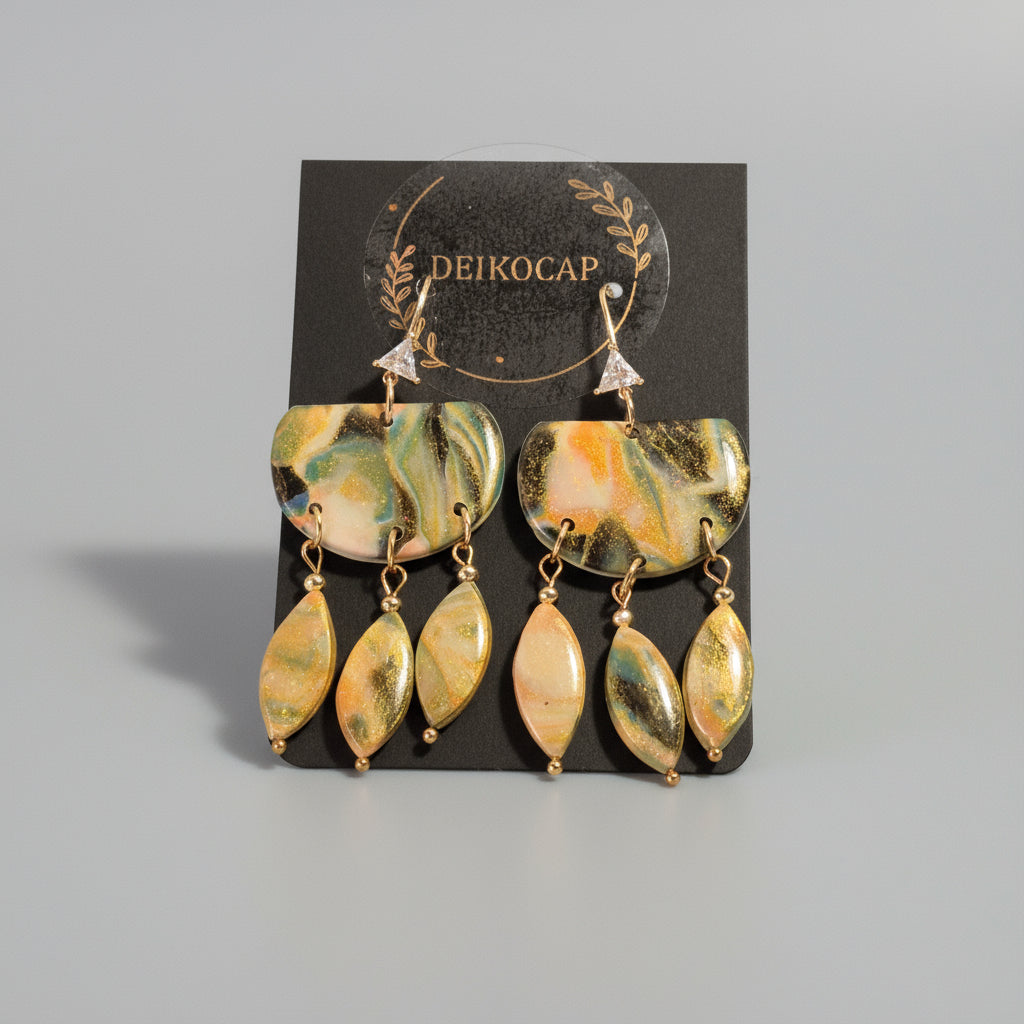 Pendientes únicos elaborados a mano en arcilla polimérica, con un diseño inspirado en los tonos y formas de la naturaleza tropical. Cada pieza combina matices de verde esmeralda, dorado, coral y marfil, creando un efecto marmoleado orgánico y sofisticado.