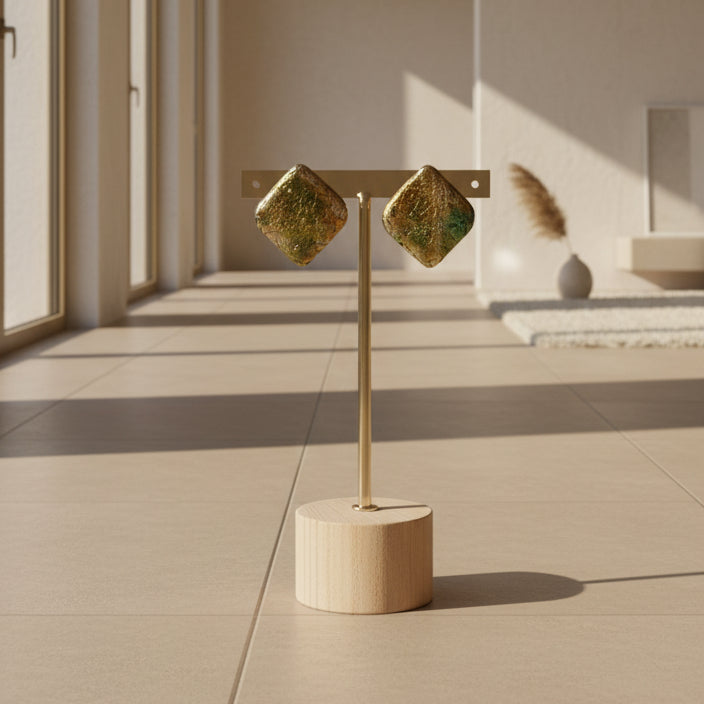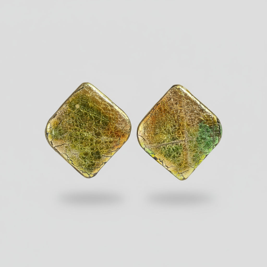 Pendientes rombo dorados con destellos verdes y efecto craquelado. Elegantes, modernos y únicos.