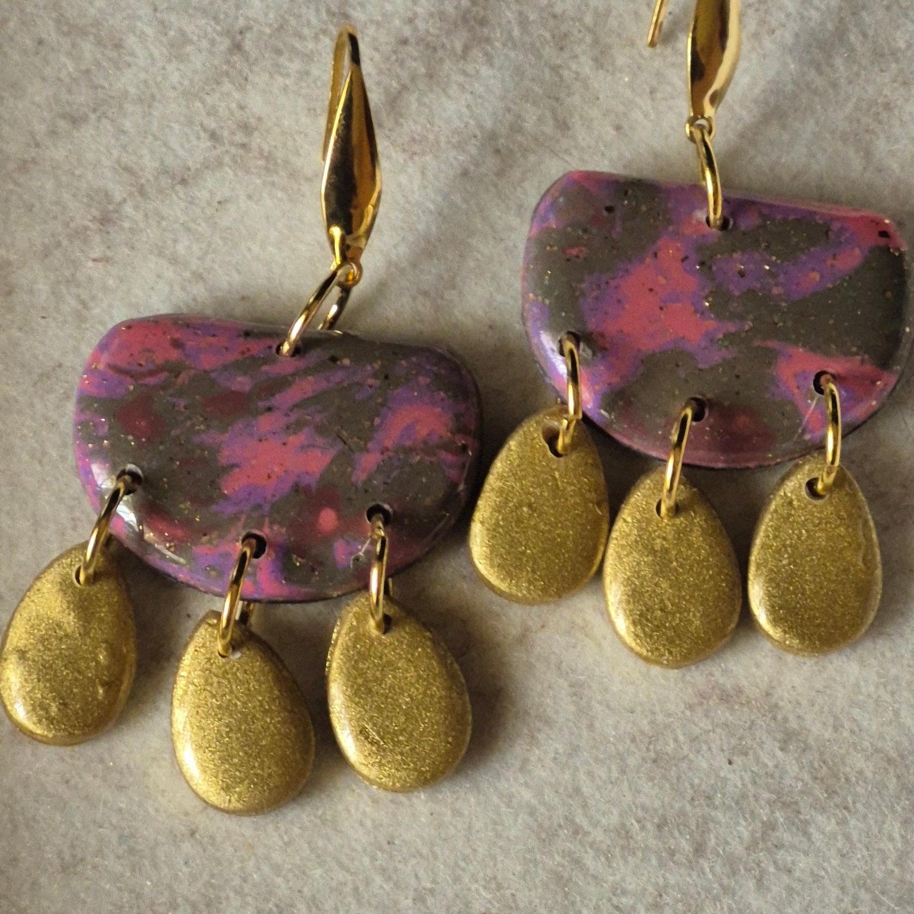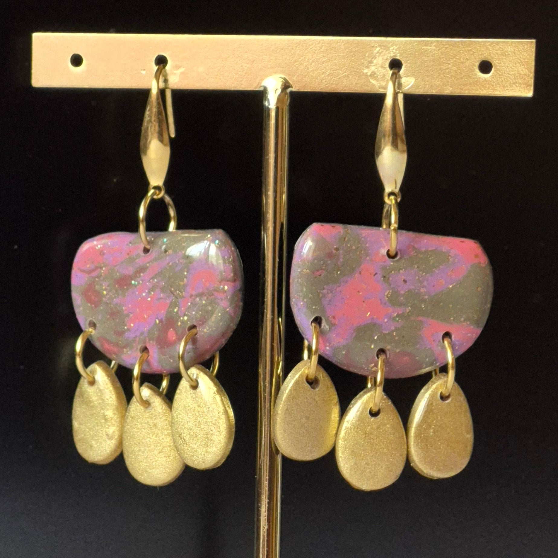 Pendientes artesanales en arcilla polimérica con un elegante patrón marmoleado en tonos rosa, gris y destellos dorados. Su diseño en forma de media luna se complementa con tres dijes dorados colgantes, creando un sutil movimiento que aporta dinamismo y luz.