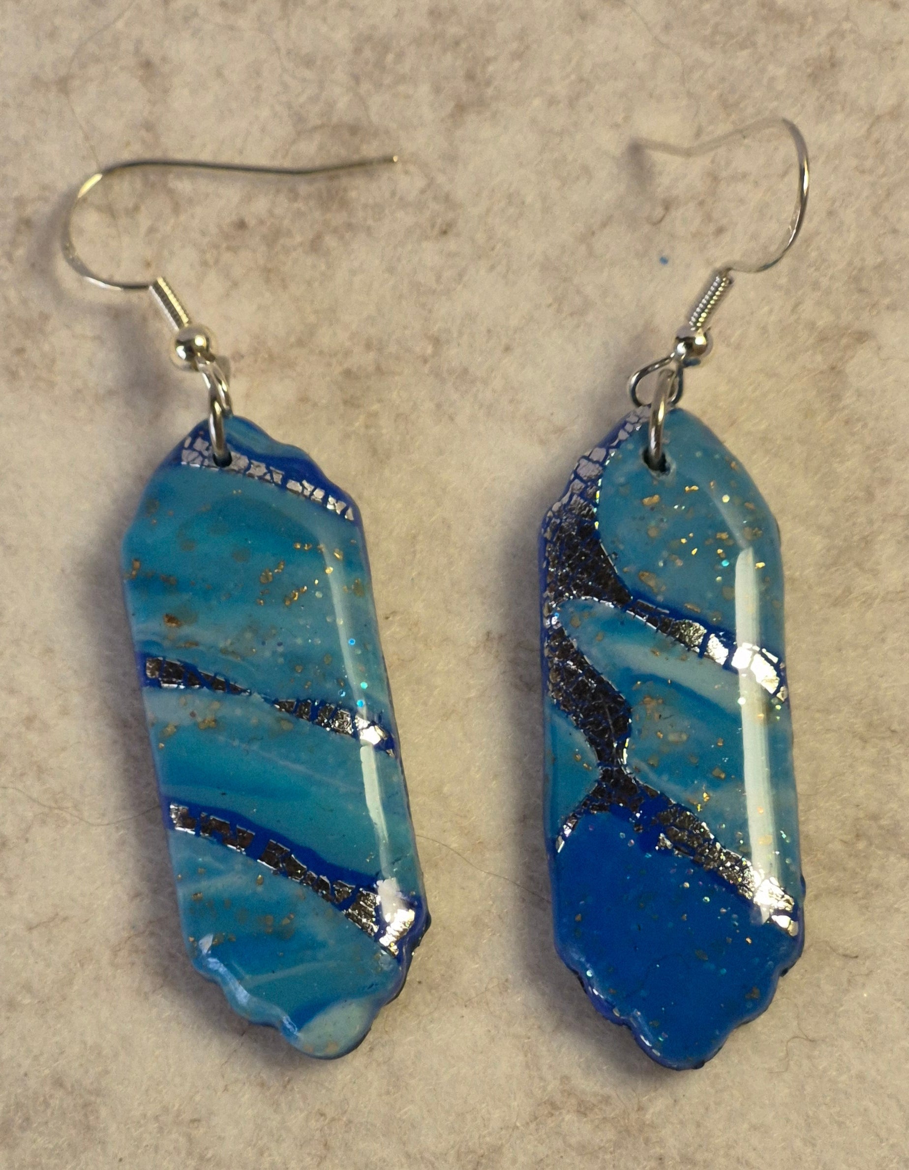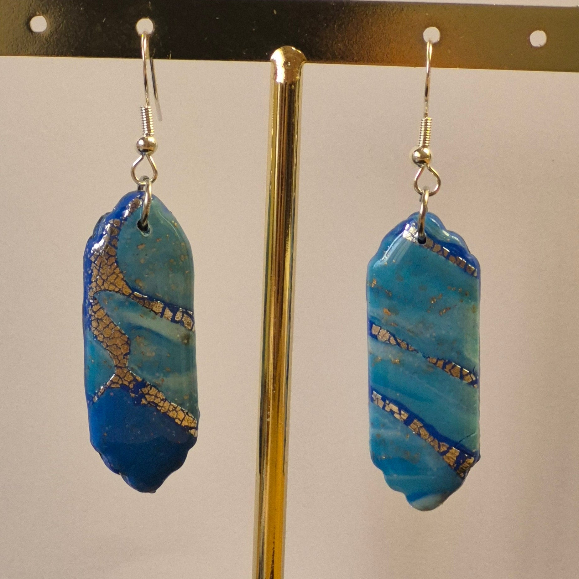 Diseñados con arcilla polimérica y acabados en resina brillante, estos pendientes alargados capturan el movimiento suave de las olas del mar. Sus tonos azules entrelazados con vetas oscuras y doradas evocan una sensación de frescura, libertad y elegancia natural.