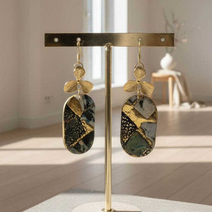 Descubre la elegancia artesanal con nuestros pendientes “Bruma Dorada” , una pieza exclusiva elaborada a mano en arcilla polimérica con detalles en foil dorado que aportan un brillo cómodo y moderno.