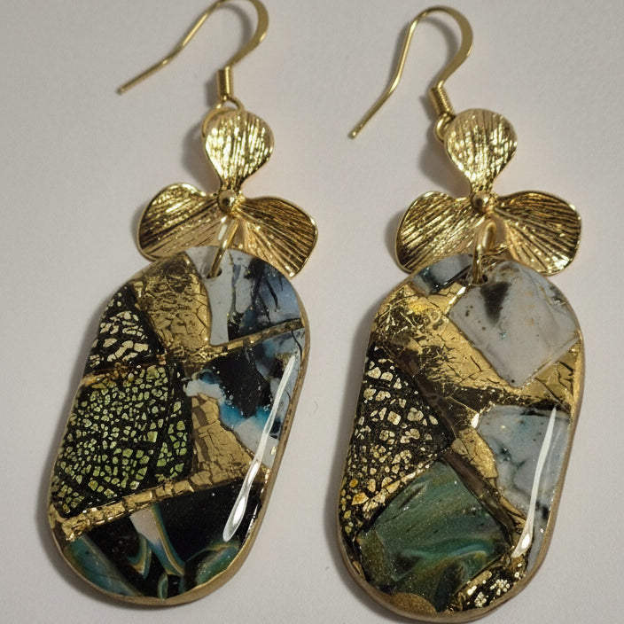Hechos a mano en arcilla polimérica con detalles dorados y charm floral. Ligeros, brillantes y únicos. Perfectos para darle un toque elegante a cualquier outfit. 🌿✨