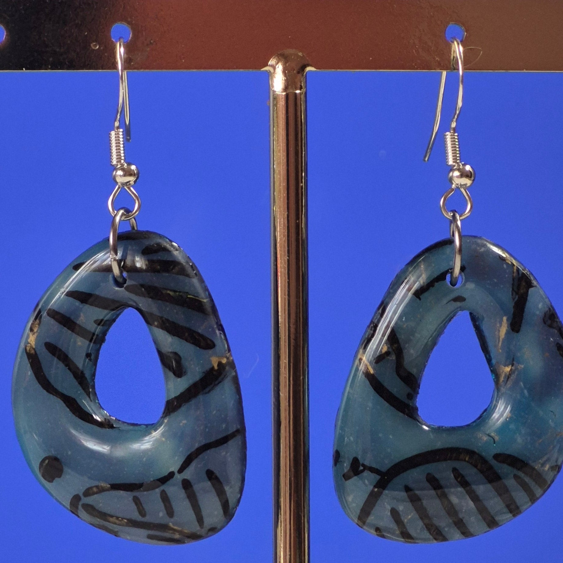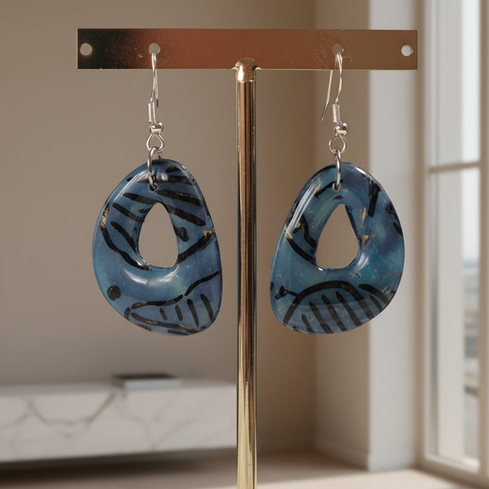 Modelados a mano en arcilla polimérica, presentan un diseño orgánico con forma irregular y tonos azul profundo con sutiles vetas negras y destellos dorados.