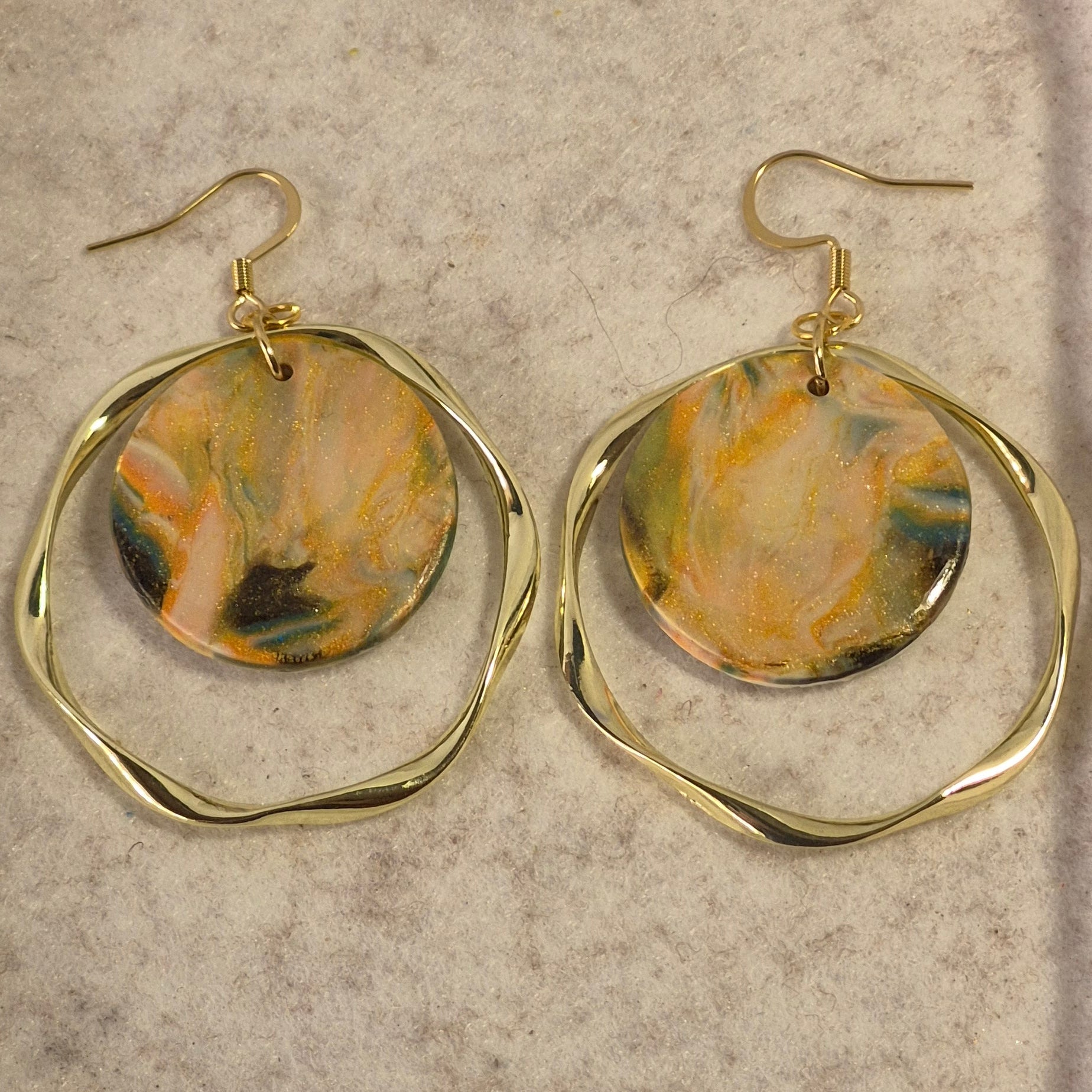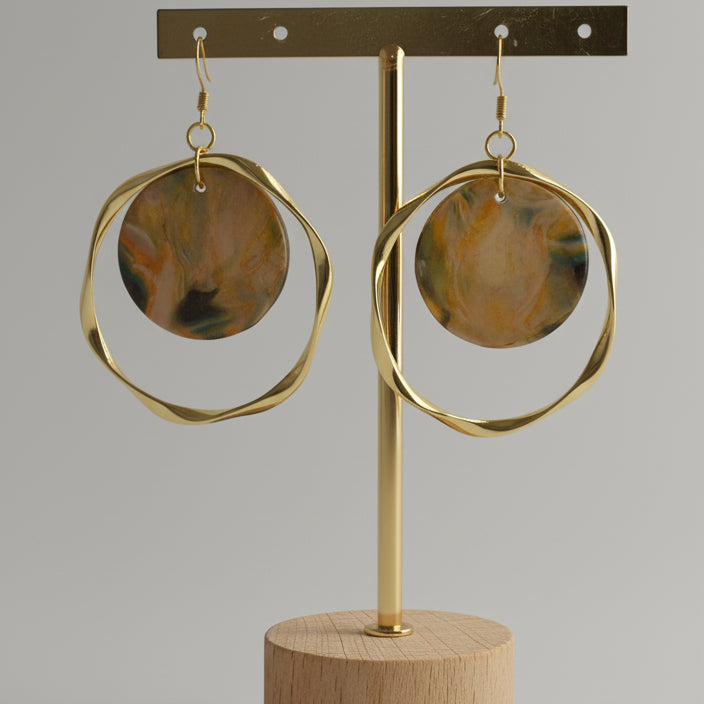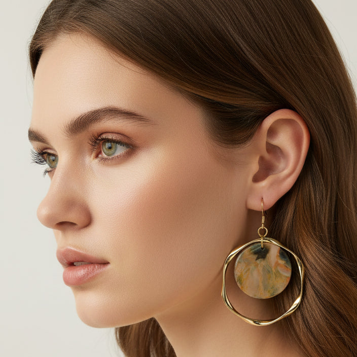 Su diseño presenta una pieza circular con matices en dorado, verde y ámbar, rodeada por un aro dorado de líneas irregulares que aporta movimiento y luminosidad. Cada par es único, ligero y cómodo, ideal para quienes aman las joyas con carácter artístico y alma natural.