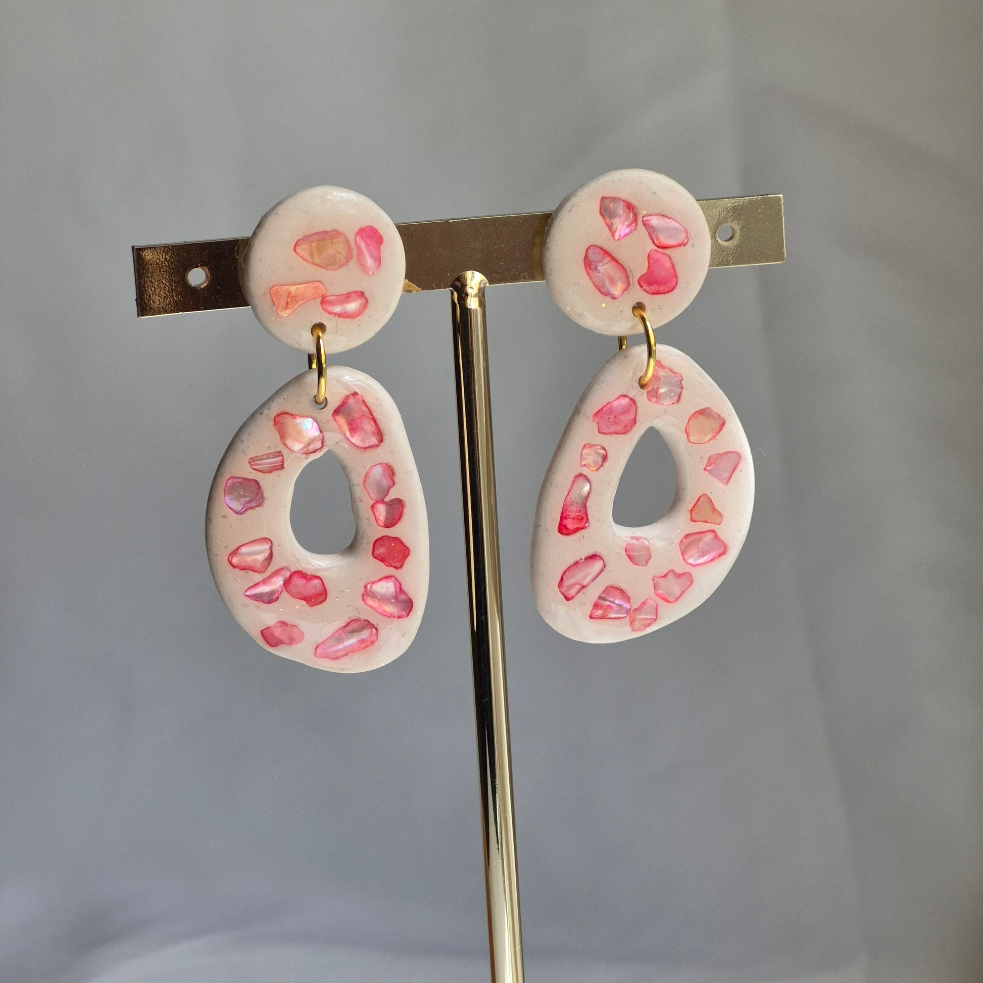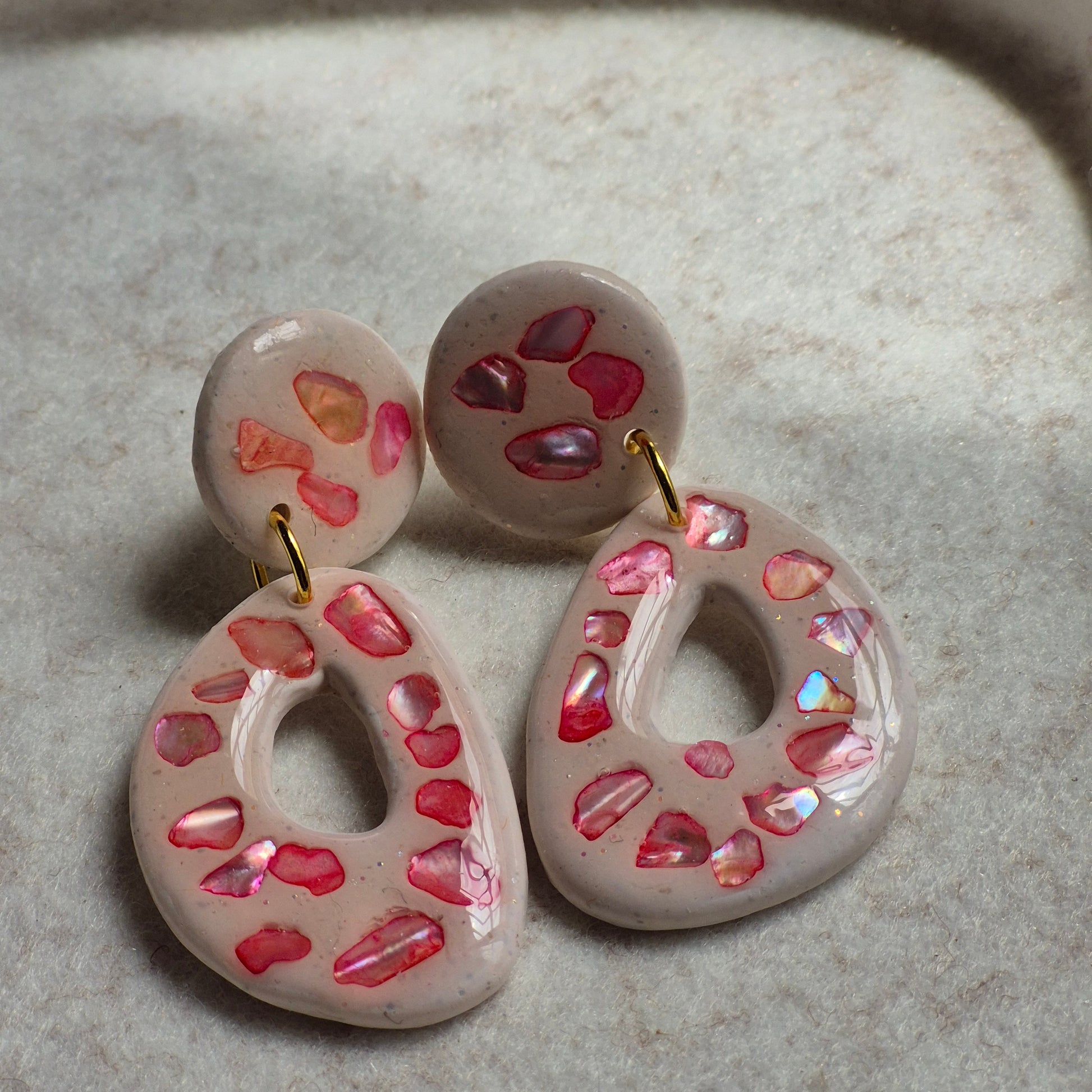 Pendientes artesanales elaborados a mano con arcilla polimérica. Su diseño único presenta una forma orgánica irregular con incrustaciones de efecto terrazo en tonos rosados y nácar iridiscente que reflejan la luz. Cuentan con una unión de aro dorado que aporta elegancia y movimiento. Ligeros, modernos y perfectos para añadir un toque artístico y colorido a cualquier look.