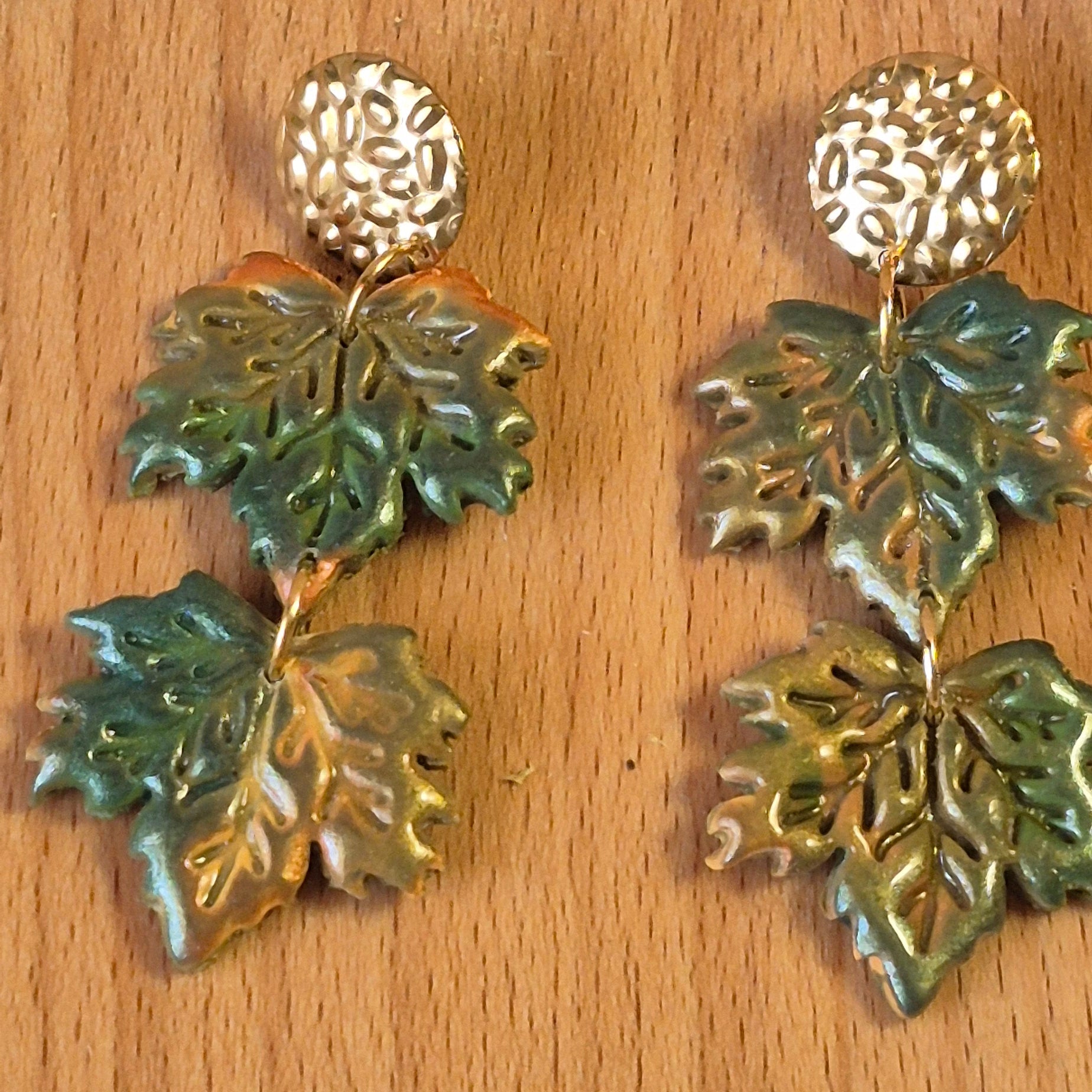 Pendientes largos y artesanales elaborados en arcilla polimérica, con diseño de doble hoja en tonos verdes y dorados que recuerdan la transición del otoño. La parte superior está compuesta por un elegante botón metálico dorado con textura martillada, que aporta brillo y sofisticación. Son ligeros a pesar de su tamaño, lo que los hace cómodos para llevar en cualquier ocasión.