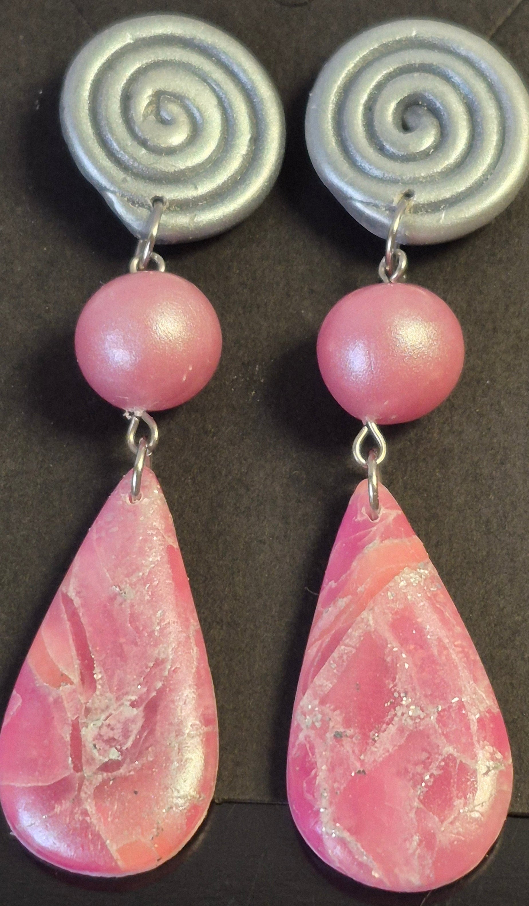 El colgante “Espiral Rosa” es una pieza artesanal vibrante y femenina, elaborada con cuentas de arcilla polimérica en tonos rosa nacarado. El diseño se centra en un medallón espiral plateado que simboliza equilibrio y energía, del cual cuelgan cinco lágrimas marmoleadas en una combinación única de rosas y blancos.