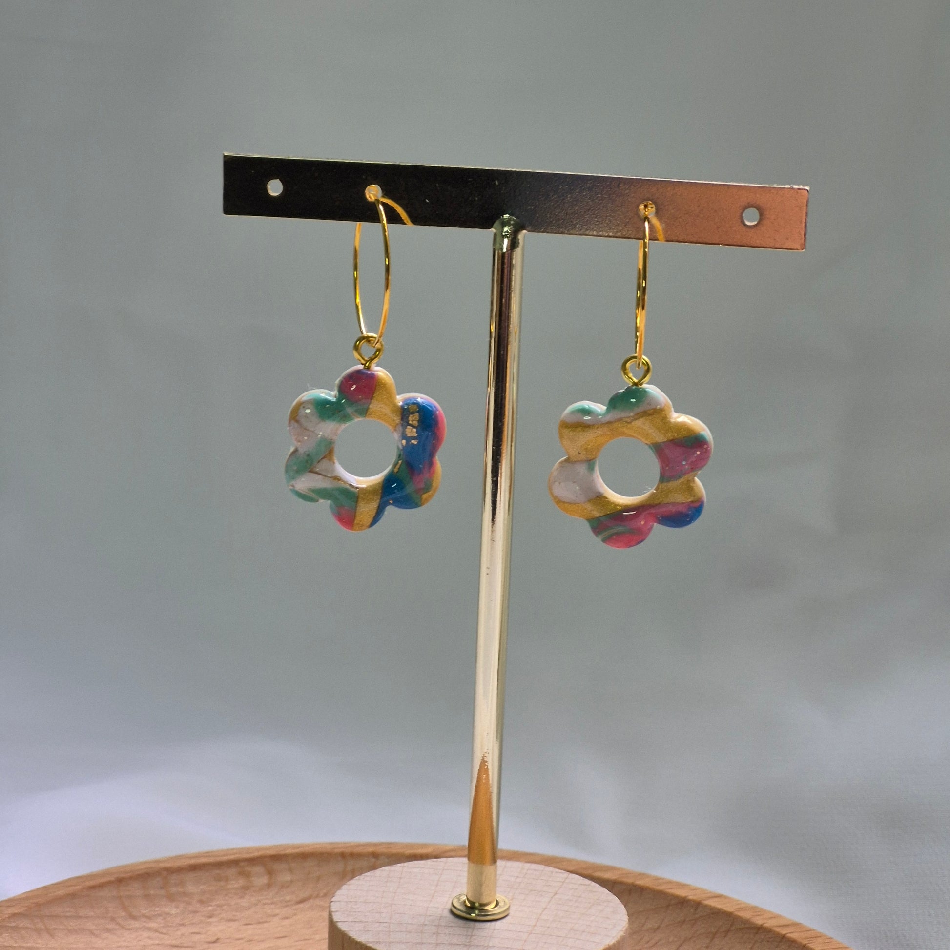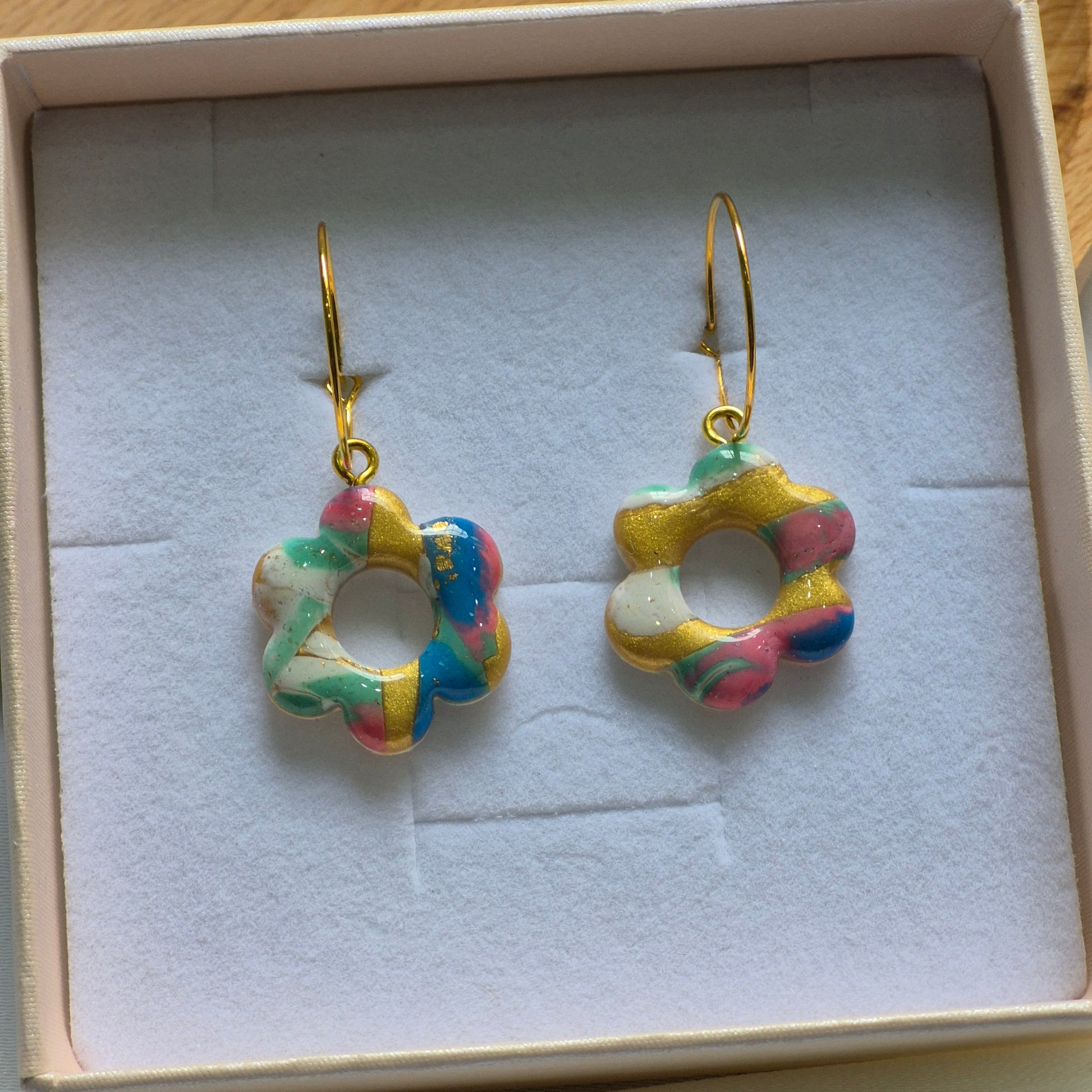 Los pendientes "Flor del Arcoíris" están hechos a mano con arcilla polimérica en forma de flor con centro abierto, evocando alegría, dulzura y frescura. Cada pétalo está bañado en una paleta vibrante de colores pastel —rosado, azul, turquesa y blanco— con acentos dorados brillantes que aportan un toque de sofisticación. Su acabado esmaltado les da un brillo elegante y resalta la intensidad de los colores.