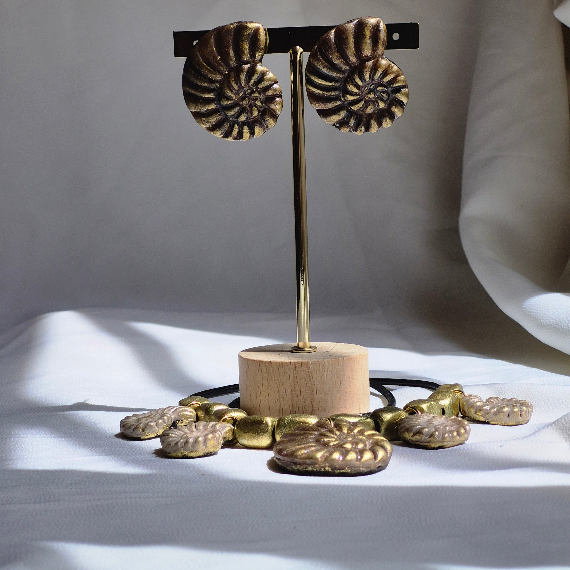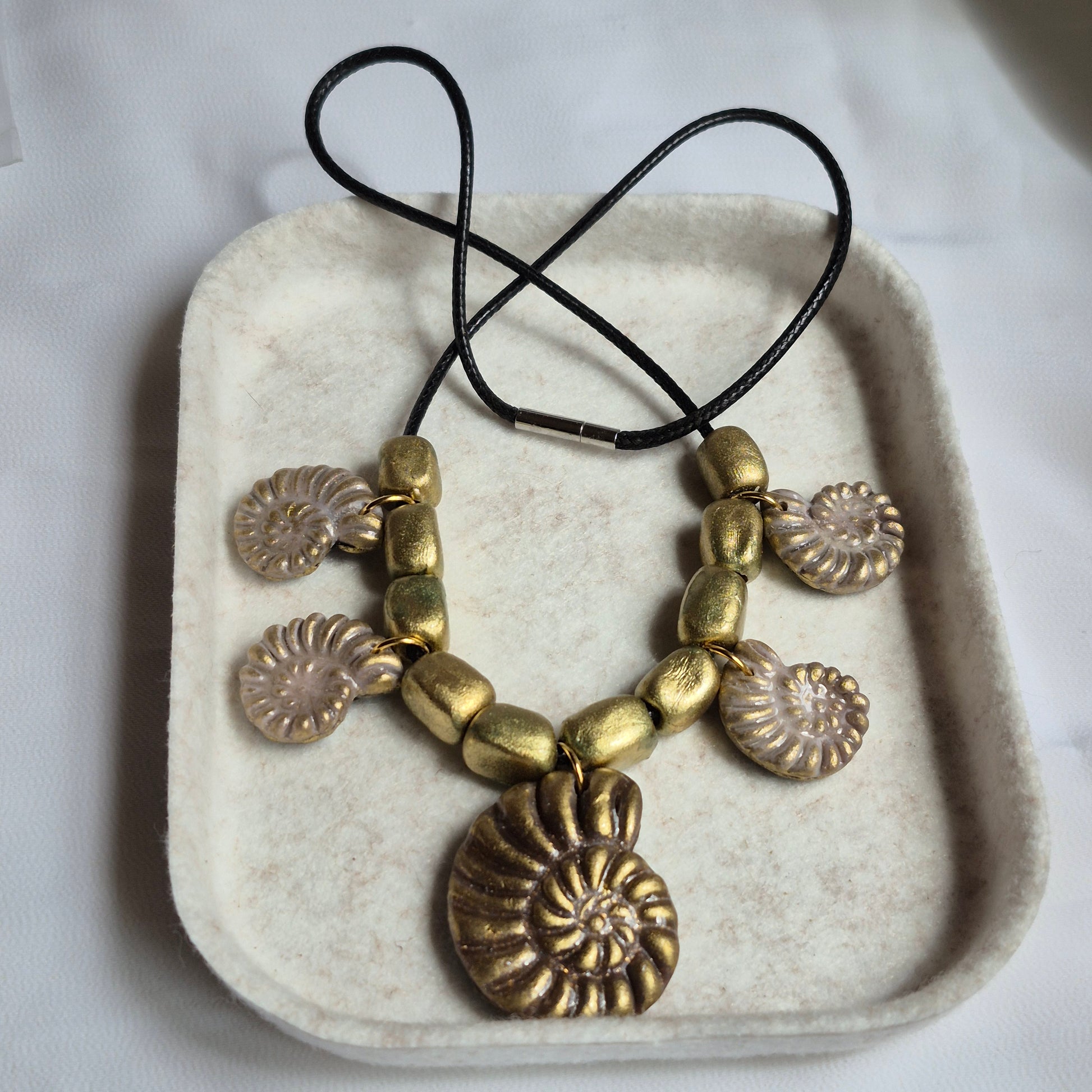 Colgante artesanal de 50 cm hecho a mano con arcilla polimérica y cordón cuero trenzado negro. Inspirado en formas de fósiles marinos, esta pieza combina cuentas doradas con acabado metálico y colgantes en forma de ammonite, evocando una estética ancestral y elegante. El colgante central destaca con un diseño más grande, que aporta fuerza visual y personalidad al conjunto.
