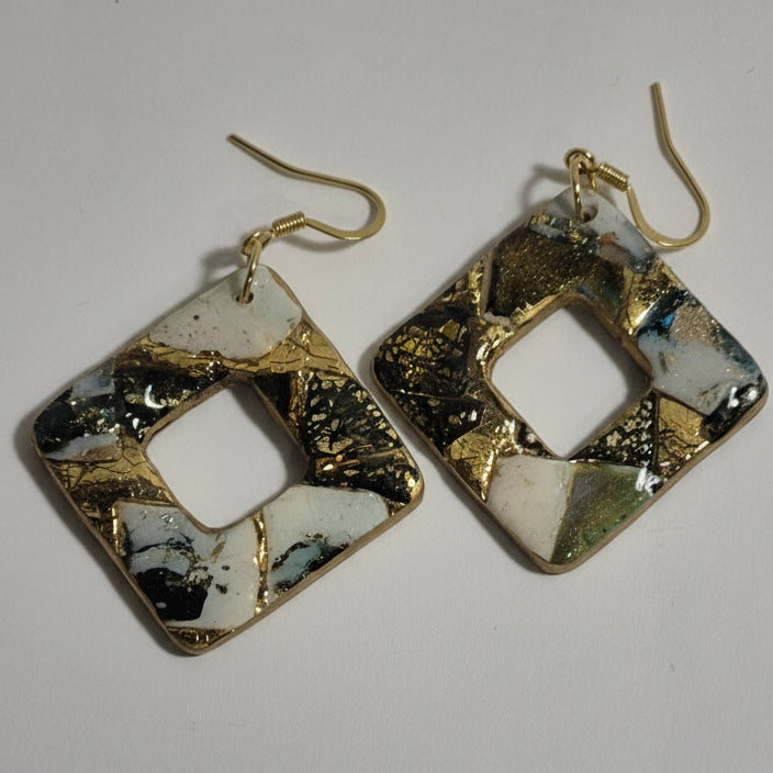 Estos pendientes de arcilla polimérica destacan por su diseño geométrico en forma de rombo , trabajados a mano con una delicada combinación de tonos blancos, negros, verdes y azulados. Las vetas doradas que atraviesan cada pieza aportan un toque elegante y luminoso, creando un estilo artístico y moderno.