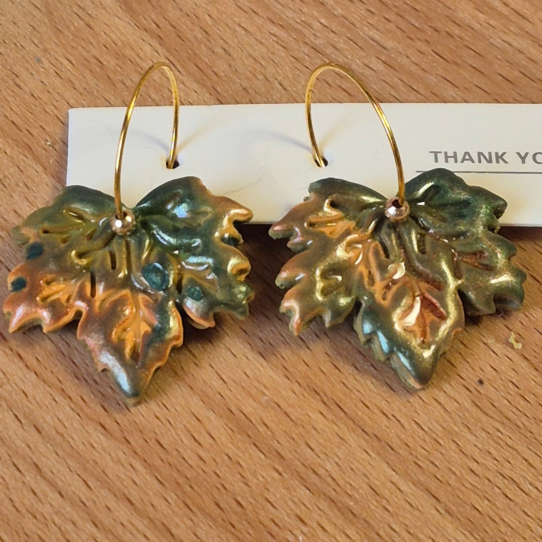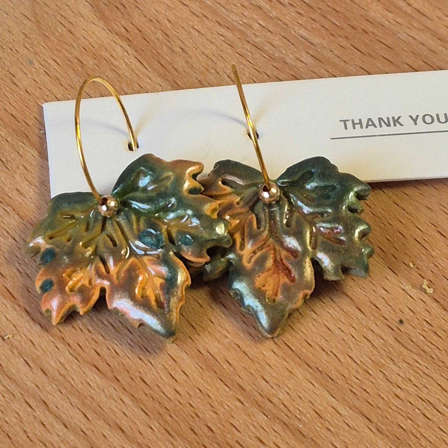 Pendientes artesanales elaborados en arcilla polimérica con forma de hoja, pintados a mano en tonos verdes y cobrizos que evocan los colores del otoño. Montados en aros dorados hipoalergénicos, ligeros y cómodos de llevar. Cada pieza es única gracias al trabajo artesanal.