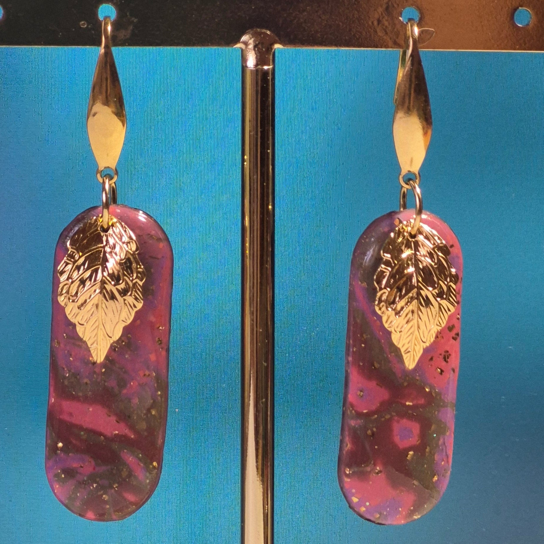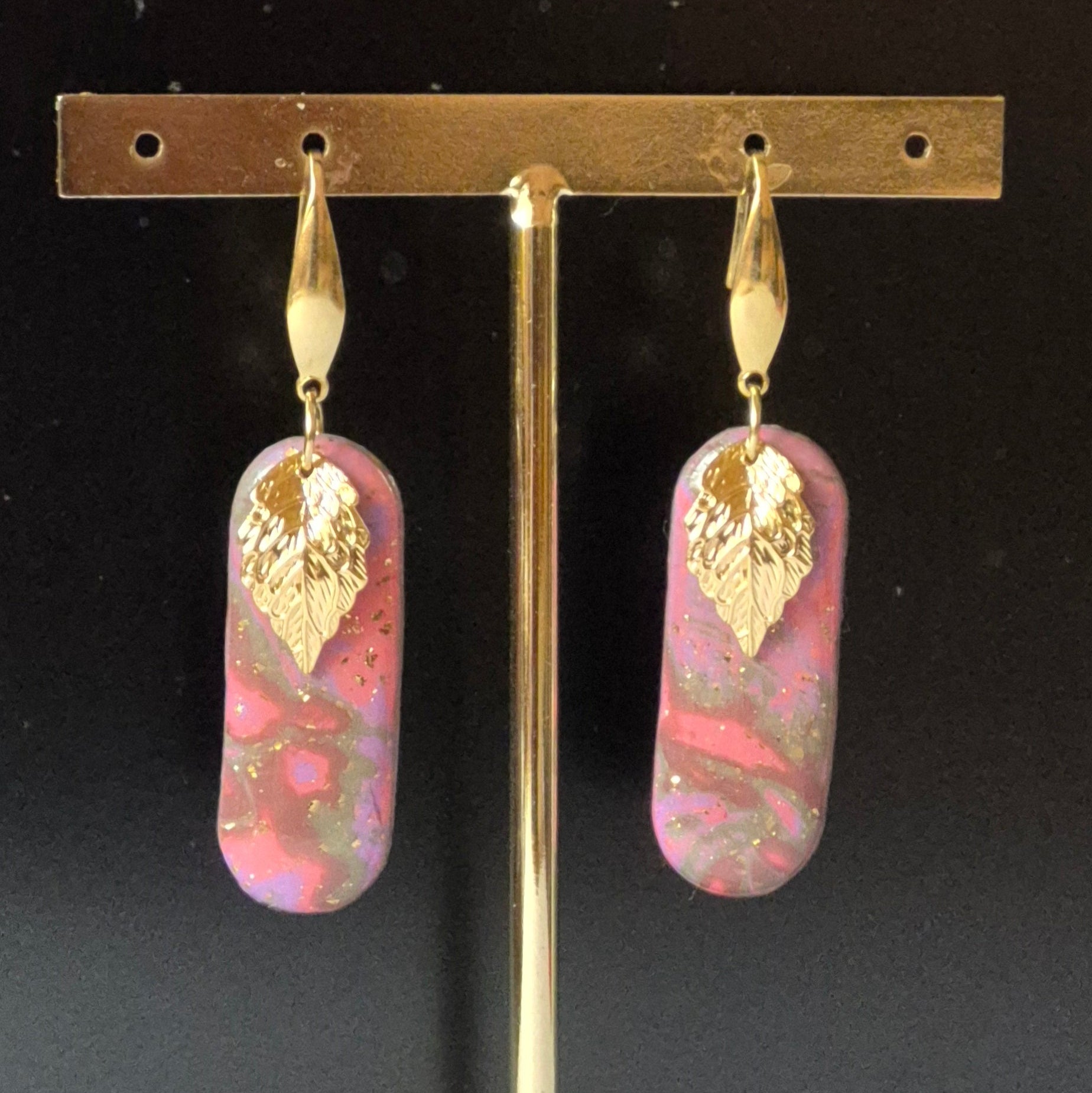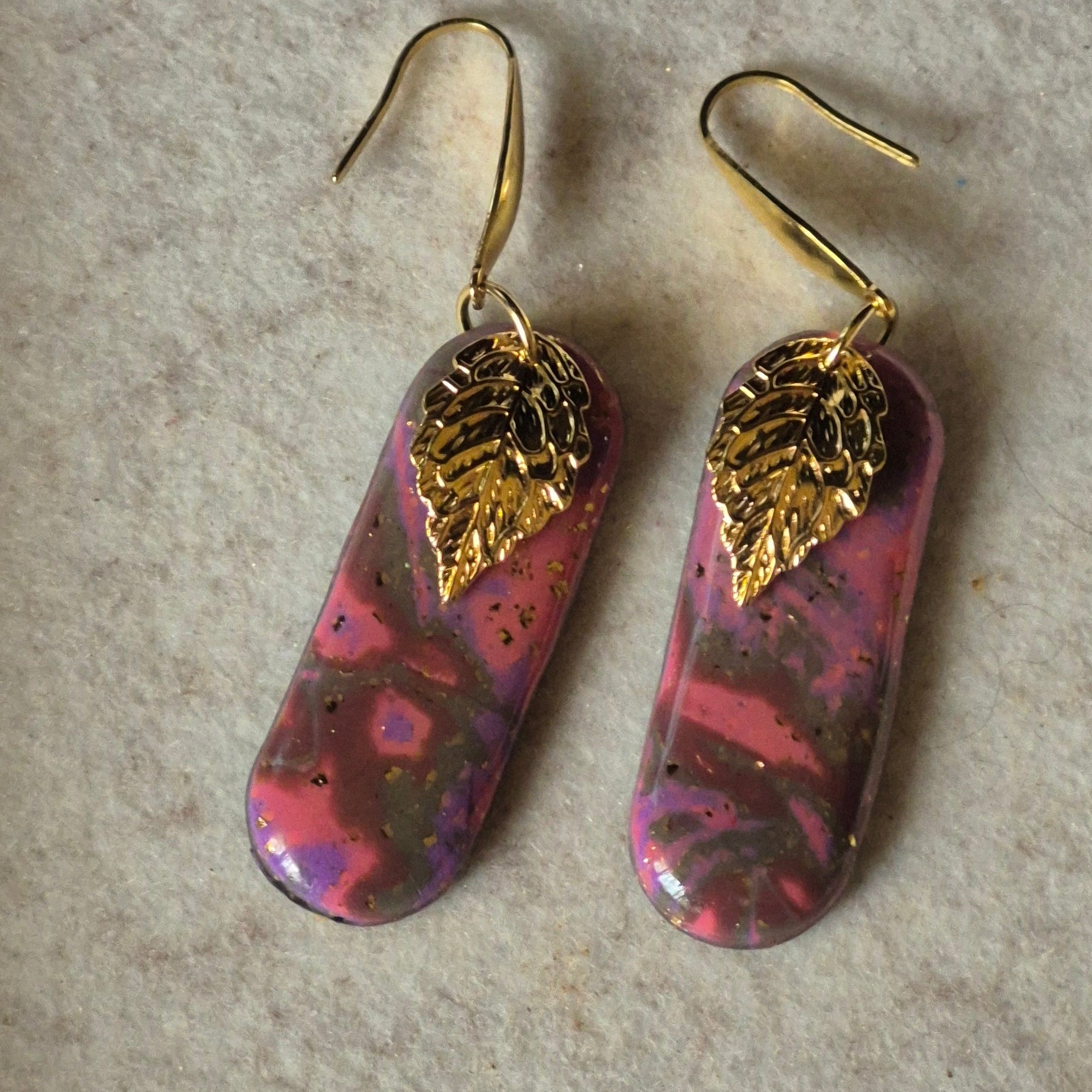 Pendientes artesanales elaborados en arcilla polimérica con acabado en tonos morado, fucsia y negro, salpicados de sutiles destellos dorados. Cada pieza está adornada con un dije de hoja metálica en tono dorado y montada en ganchos de acero inoxidable hipoalergénico, ideales para uso diario. Su diseño alargado y elegante añade un toque de naturaleza y sofisticación a cualquier look.