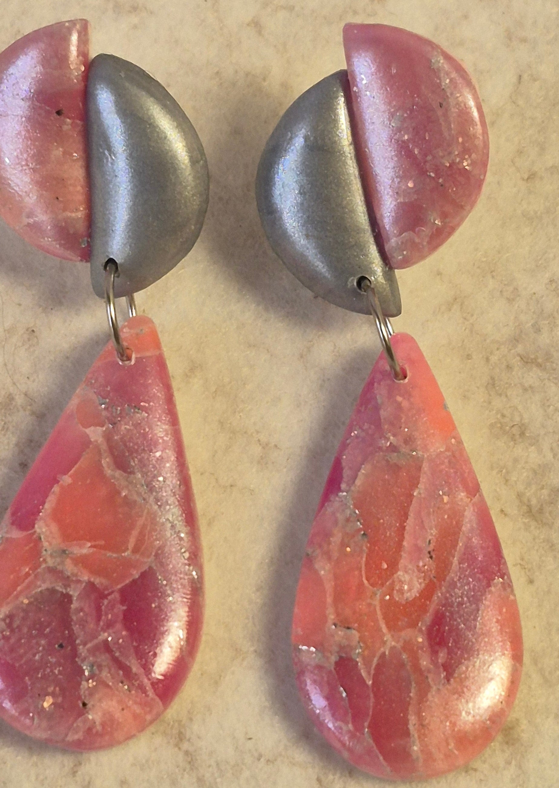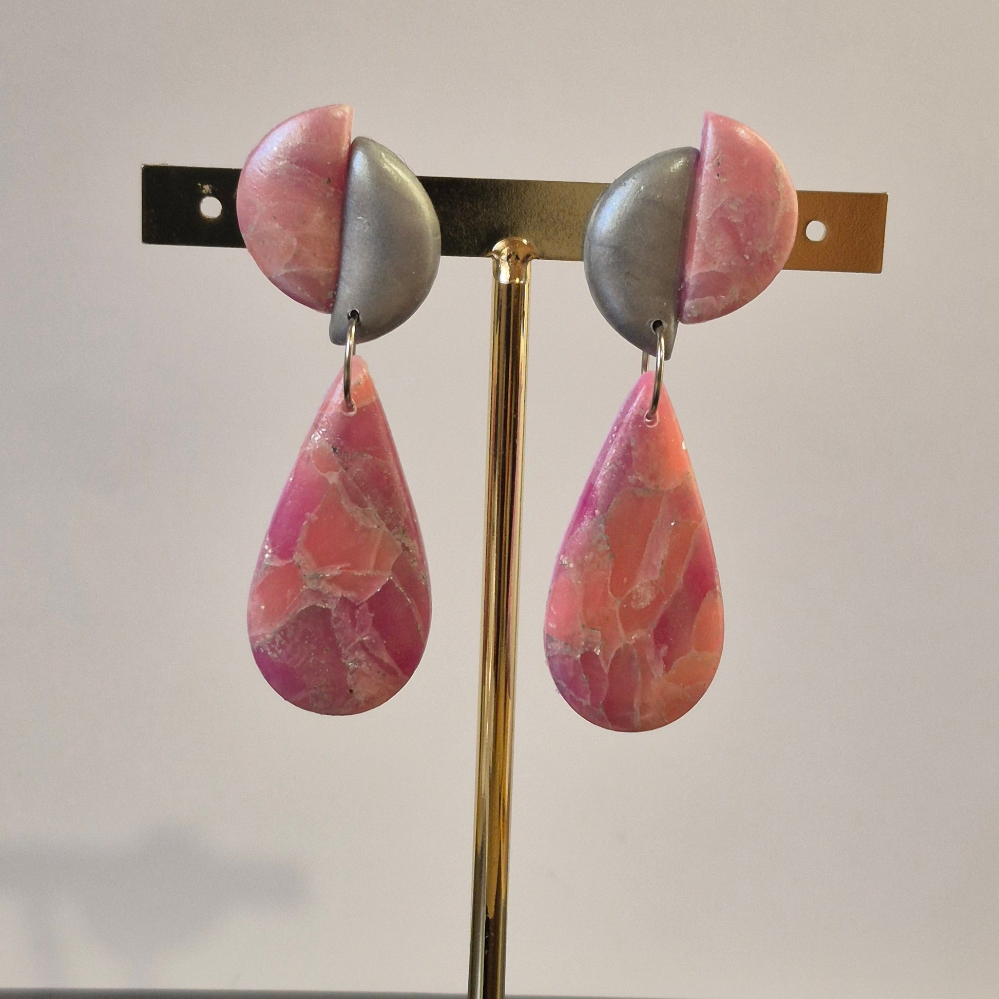 Los pendientes “Luna y Gota” destacan por su diseño creativo y elegante. Están hechos a mano en arcilla polimérica, combinando la suavidad de una media luna en tono plata con una lágrima marmoleada en rosa, coral y toques nacarados.