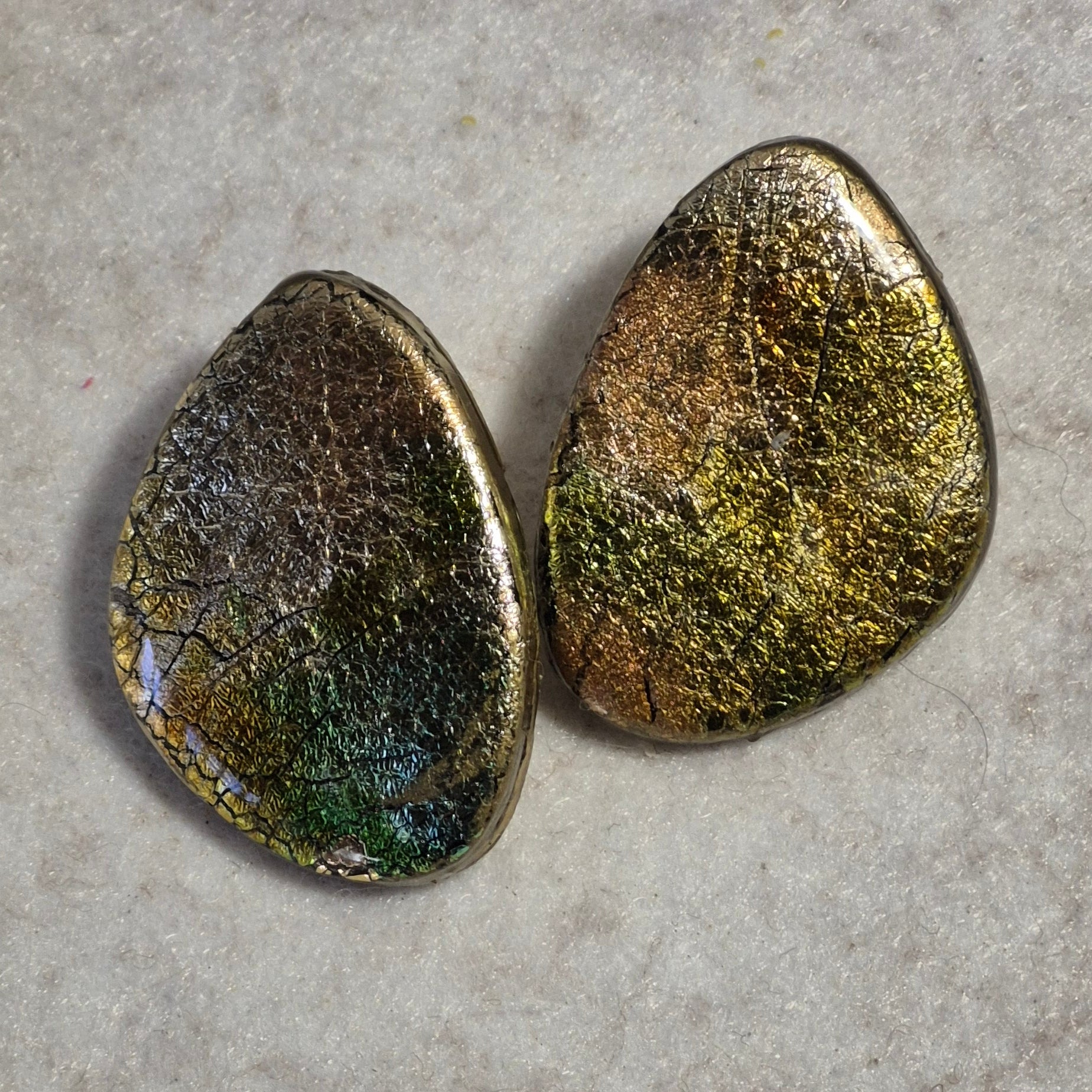 Pendientes artesanales en arcilla polimérica con efecto metálico craquelado en tonos oro, verde y cobre. Brillo único y engarce en acero inoxidable.