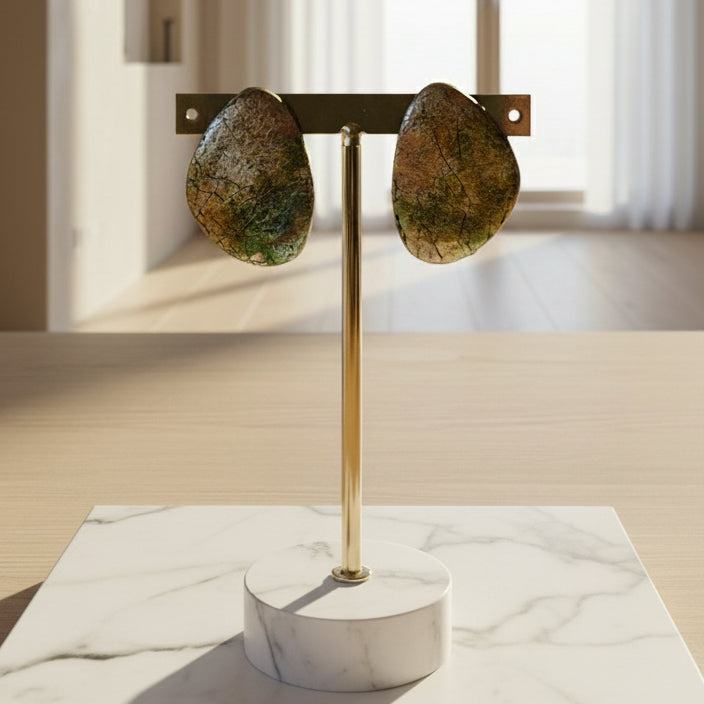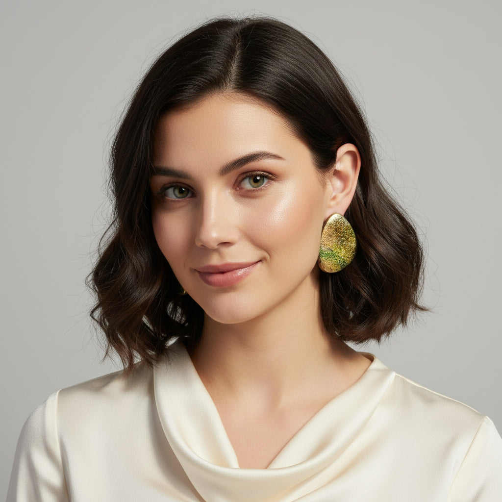 Los pendientes Luz Dorada están hechos a mano en arcilla polimérica con un acabado metálico craquelado que combina tonos dorados, verdes y cobrizos. Su forma orgánica y su brillo profundo crean un efecto único que cambia con la luz.