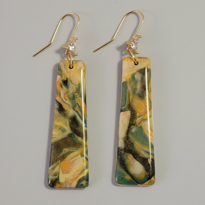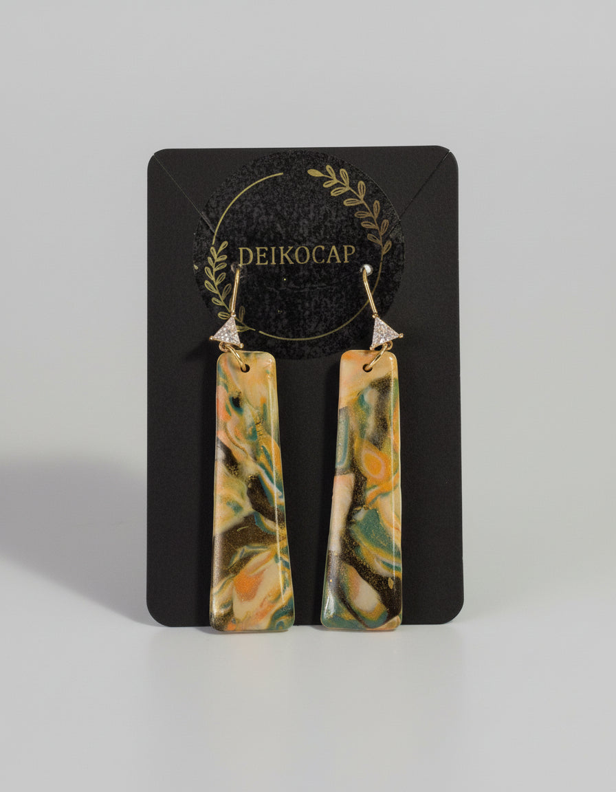 Los pendientes Marea Dorada son una pieza artesanal única, creados a mano con arcilla polimérica y acabados que evocan el movimiento del mar entre tonos dorados, verdes, negros y sutiles matices cobrizos. Su forma alargada y elegante estiliza el rostro, mientras que el gancho con circonita brillante y acero inoxidable dorado añade un toque de sofisticación y resistencia.