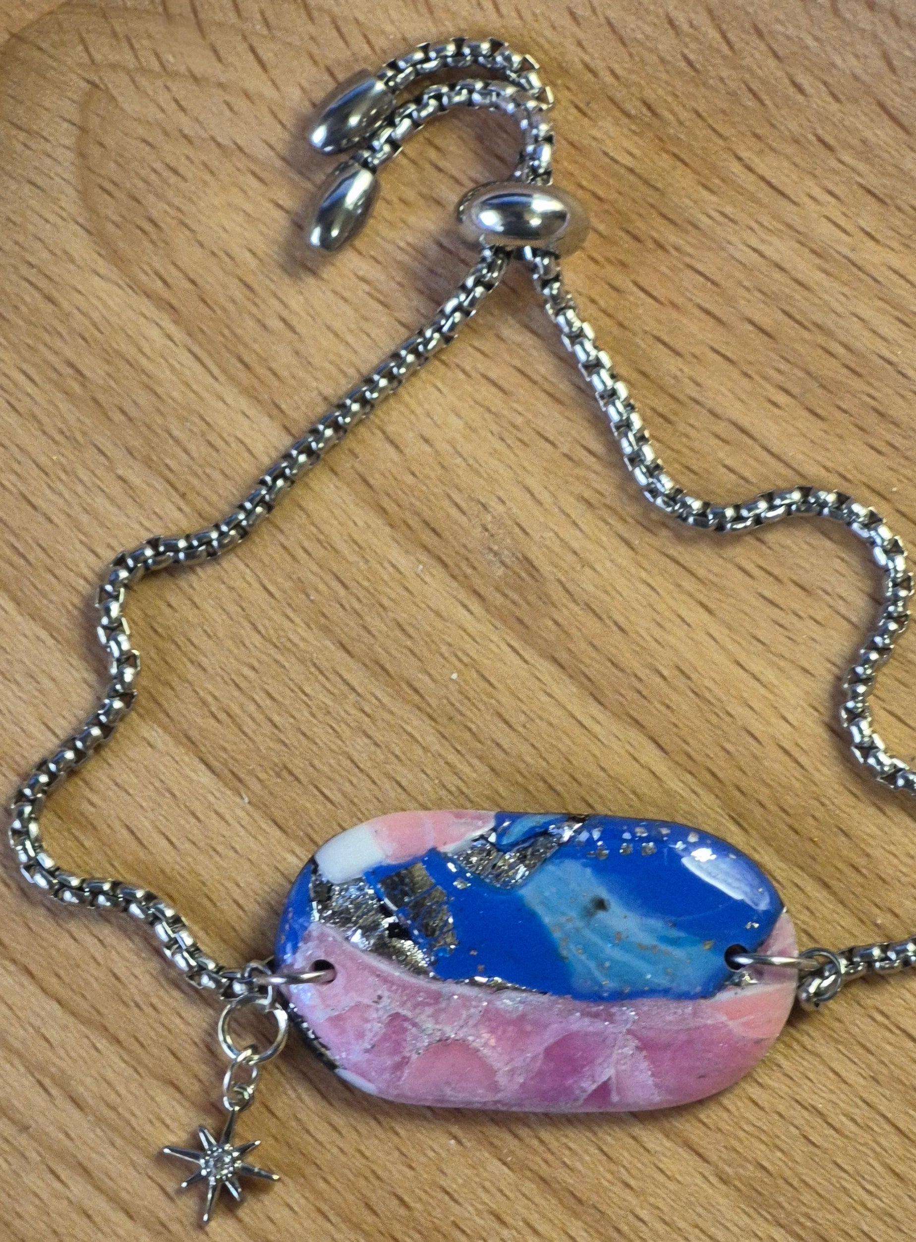 Pulsera artesanal hecha con arcilla polimérica en tonos rosa, azul cielo y azul intenso, con detalles dorados que evocan la magia de la aurora boreal. La pieza central está montada en una cadena de acero inoxidable ajustable con sistema deslizable para adaptarse a cualquier muñeca, asegurando comodidad y durabilidad.