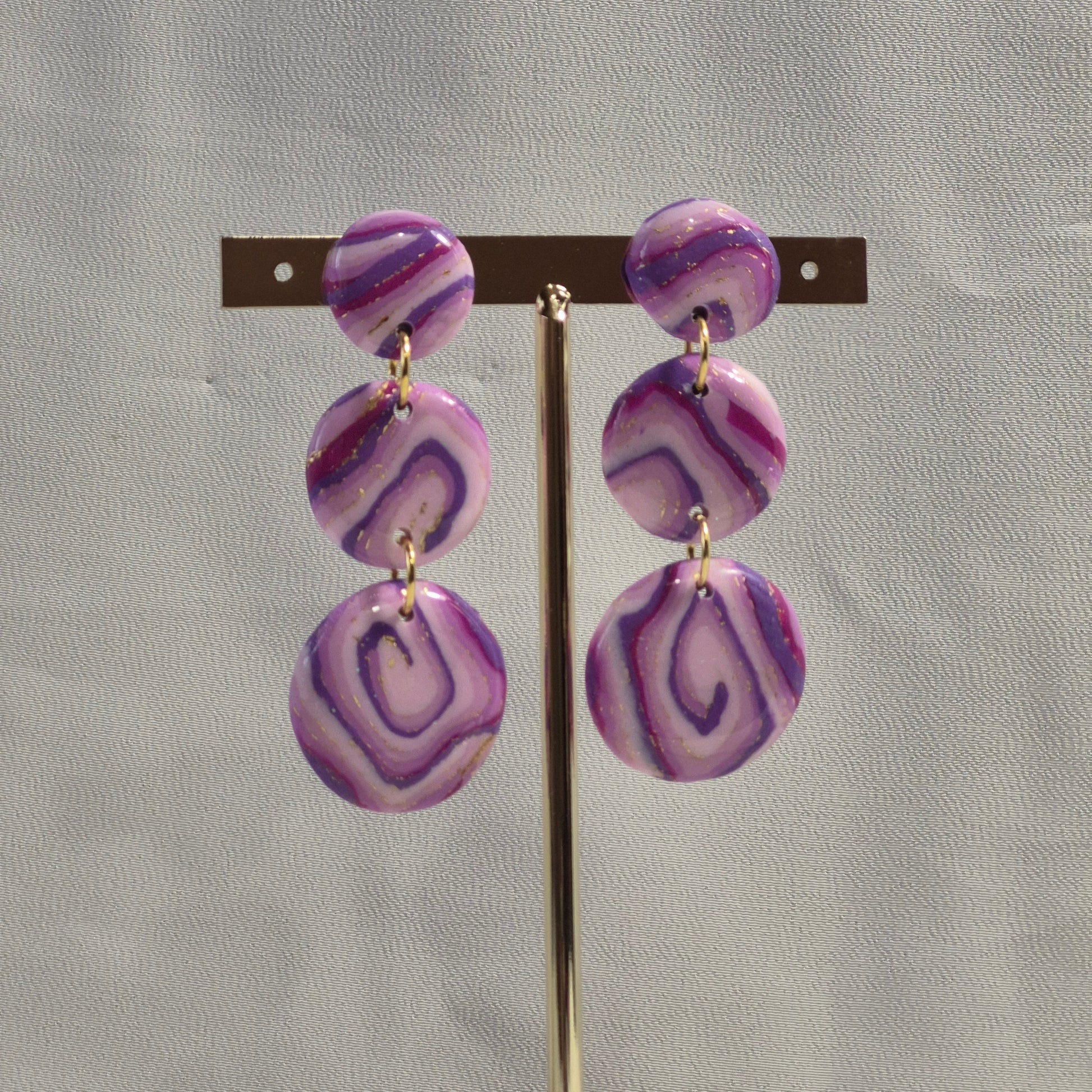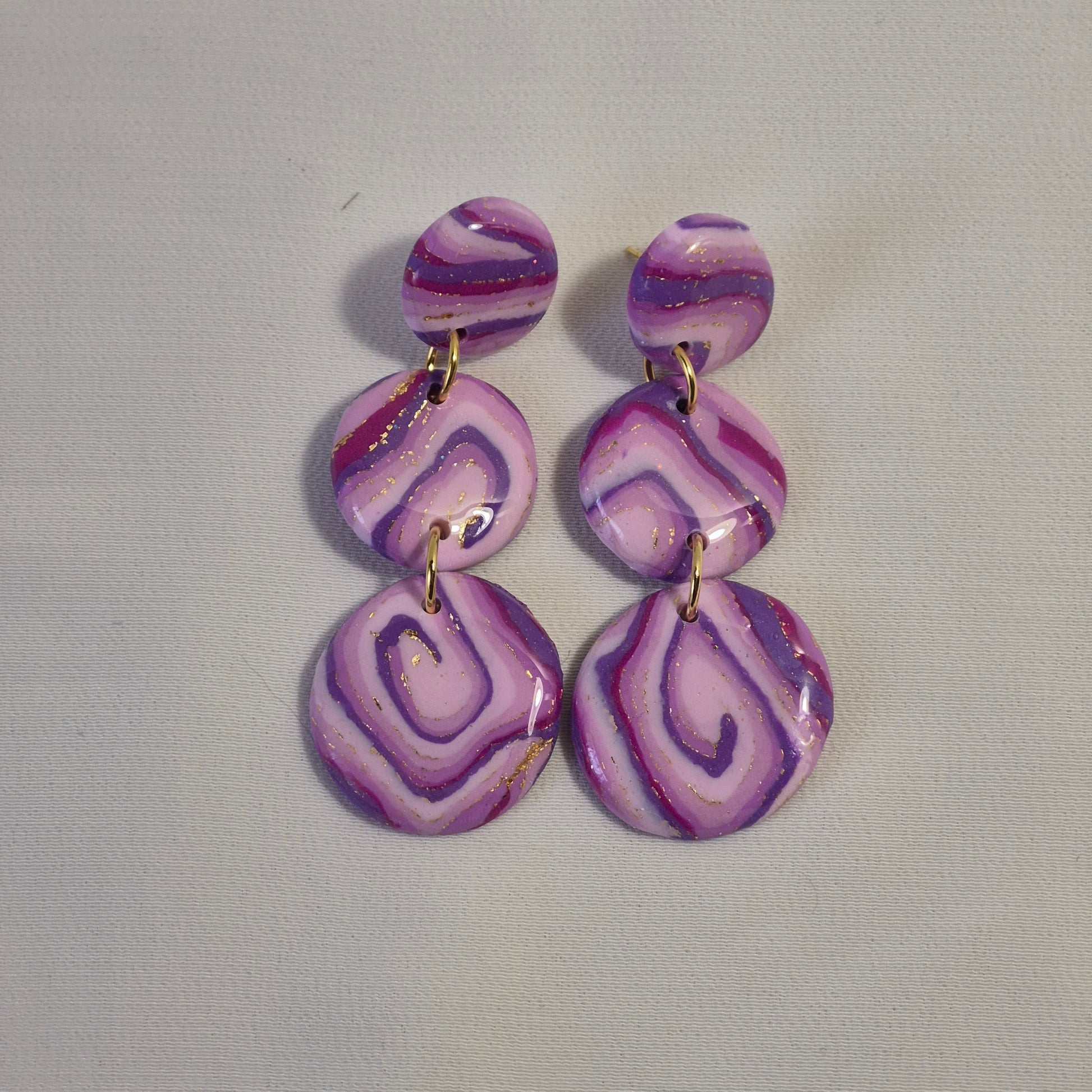 Pendientes artesanales de arcilla polimérica en tonos lilas, fucsias y violetas con detalles dorados que imitan la apariencia de vetas geológicas o galaxias psicodélicas. Están compuestos por tres piezas circulares unidas entre sí, lo que les aporta un movimiento fluido y llamativo.