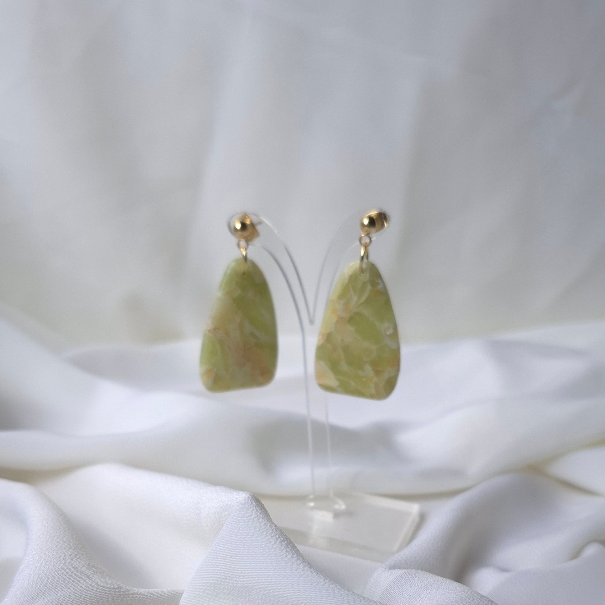 Estos exquisitos pendientes presentan piedras verdes de aspecto natural con delicadas vetas beige y doradas, creando una estética orgánica pero sofisticada. La forma triangular añade un toque moderno, mientras que los detalles en tono dorado complementan maravillosamente los matices terrosos. Perfectos para agregar una declaración sutil a cualquier conjunto, estos pendientes irradian elegancia y originalidad.