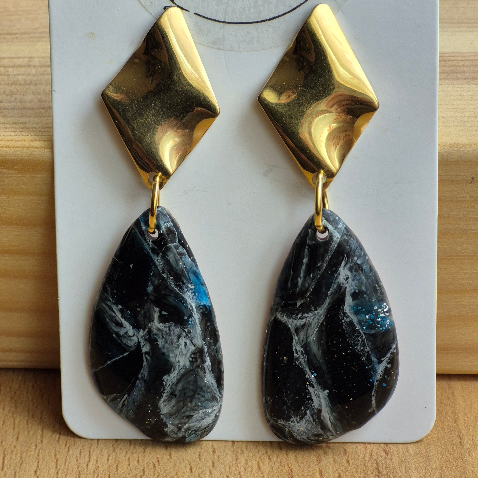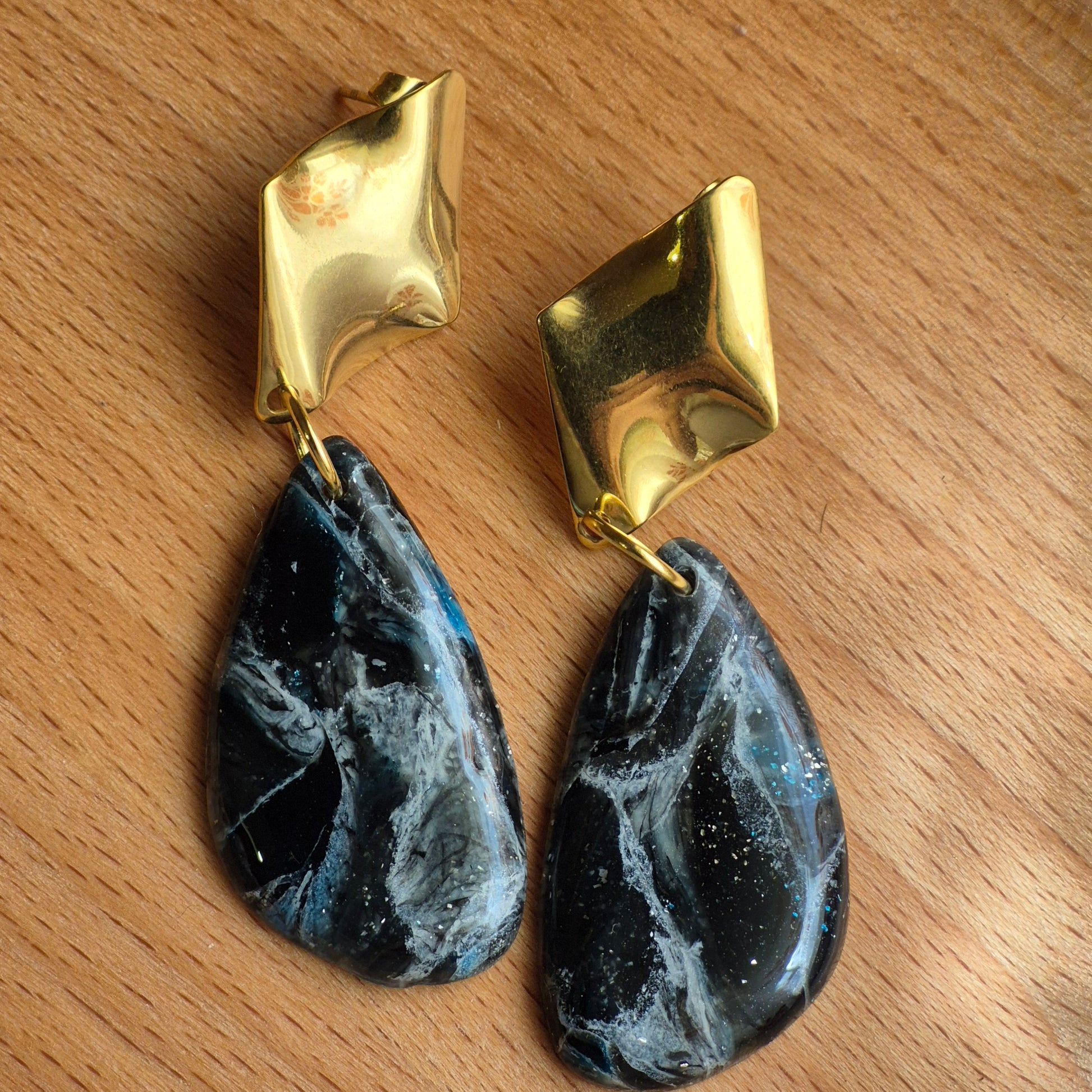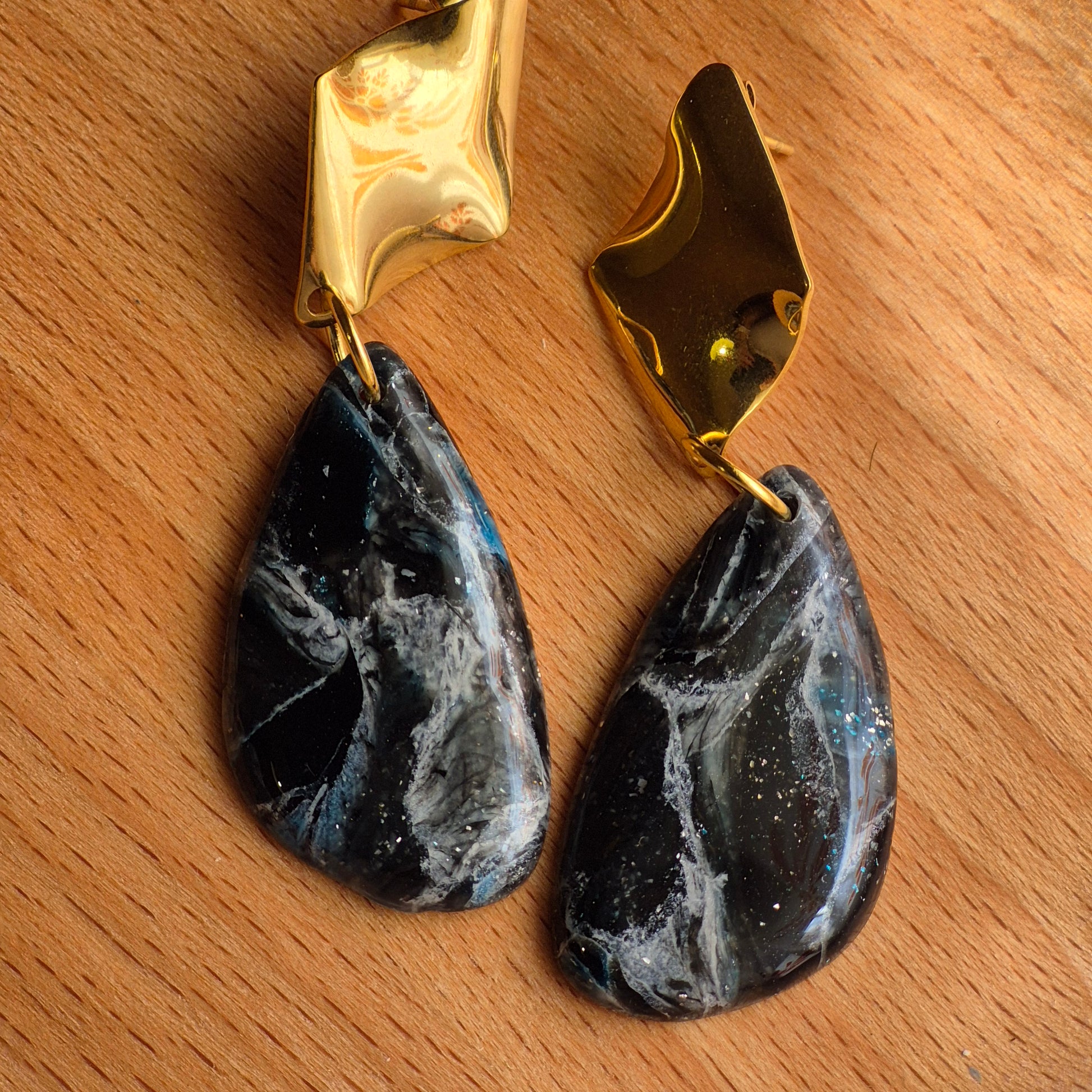 Los pendientes "Noche Estelar" combinan la fuerza del metal dorado con la belleza orgánica de la arcilla polimérica en tonos negro, gris y azul. Su diseño elegante y brillante recuerda a un cielo nocturno salpicado de estrellas. Son ligeros, deseados y únicos.
