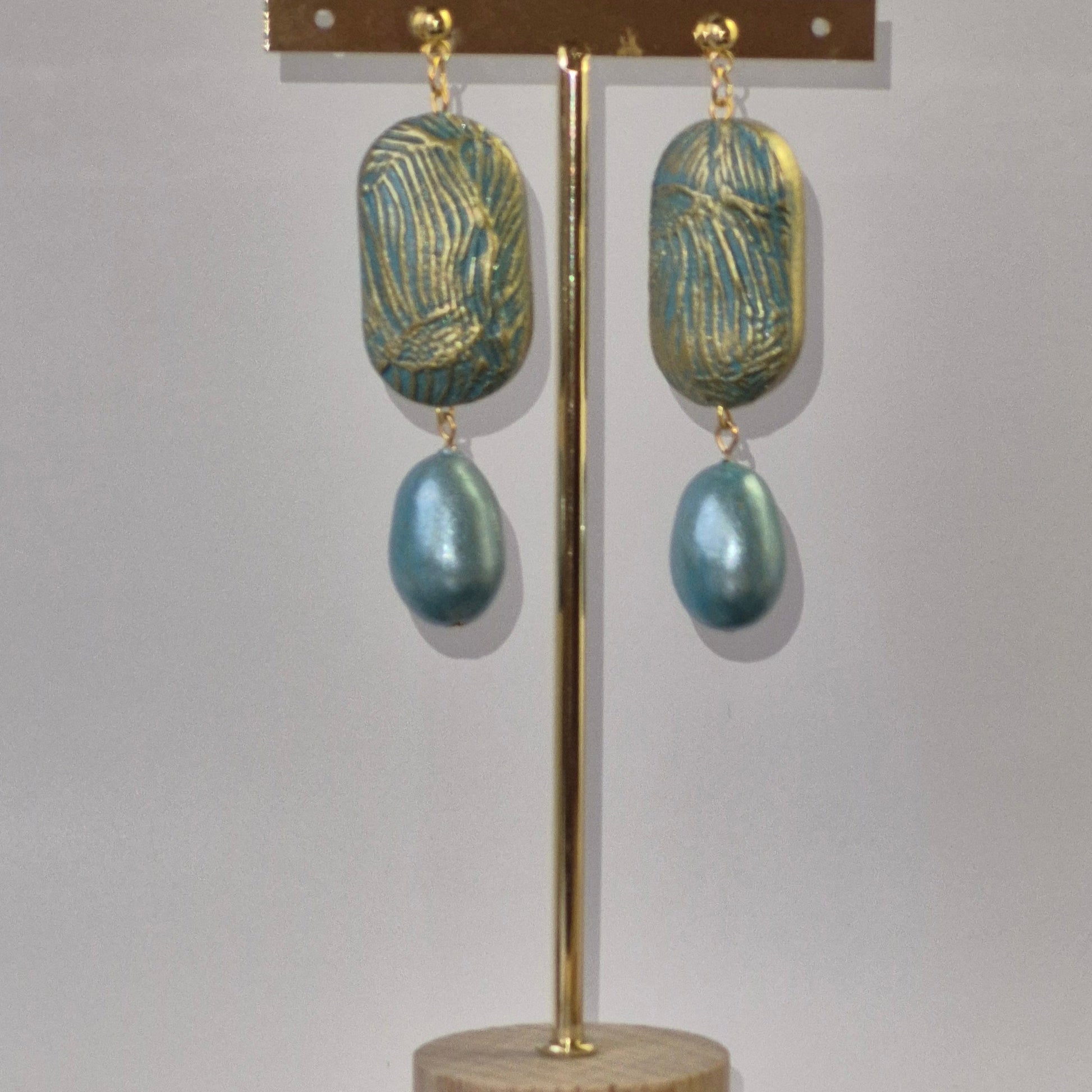 Los pendientes Oasis Dorado combinan elegancia y textura en una pieza única hecha a mano. La parte superior, en arcilla polimérica azul turquesa, presenta un delicado relieve dorado con efecto textil, que aporta profundidad y brillo. La pieza inferior, una cuenta orgánica de acabado perlado en azul cielo, añade movimiento y un toque luminoso.