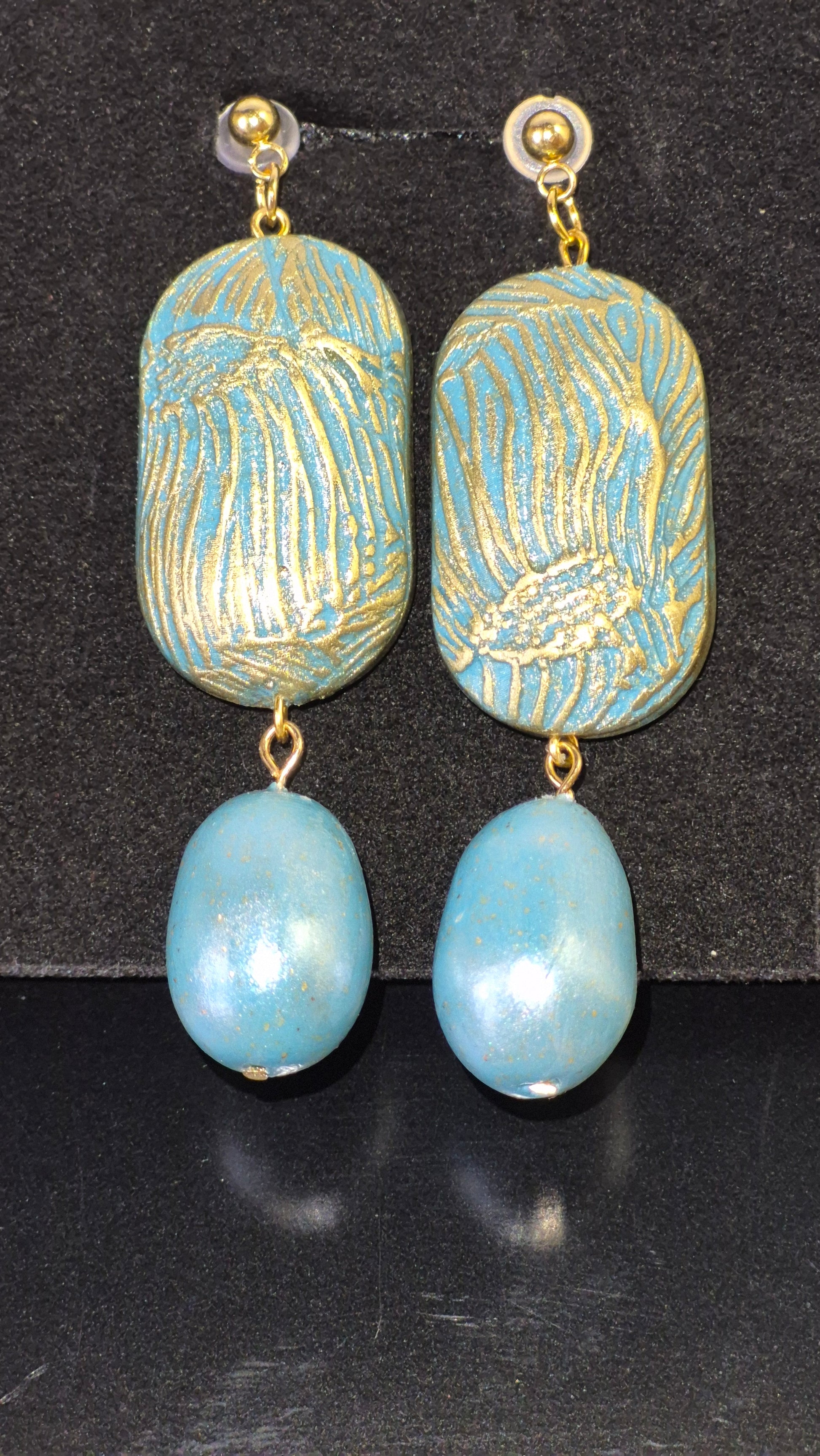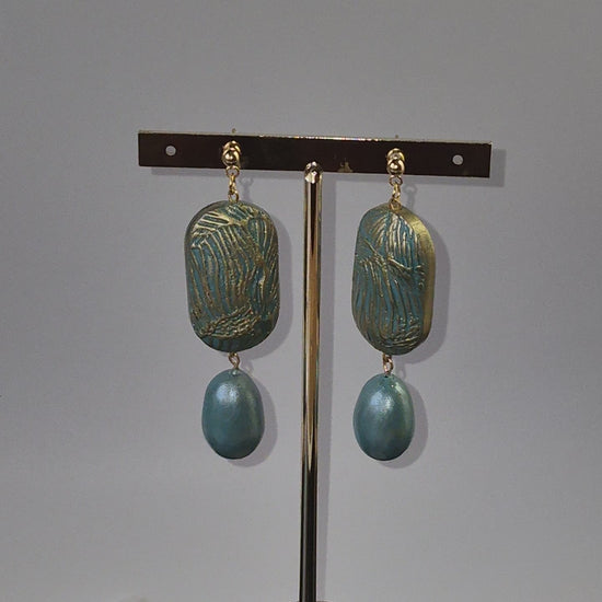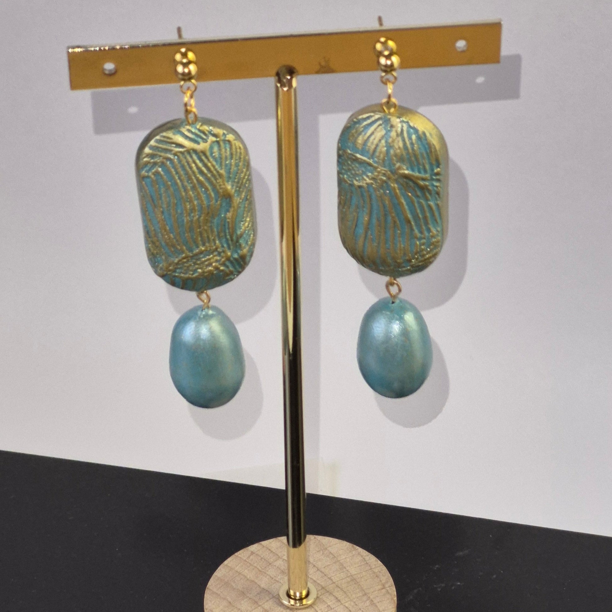 Diseñados en arcilla polimérica con textura en dorado sobre azul turquesa, evocan los reflejos del sol en un oasis escondido en el desierto. Su diseño se completa con una gota en azul perlado que aporta movimiento y luminosidad.
