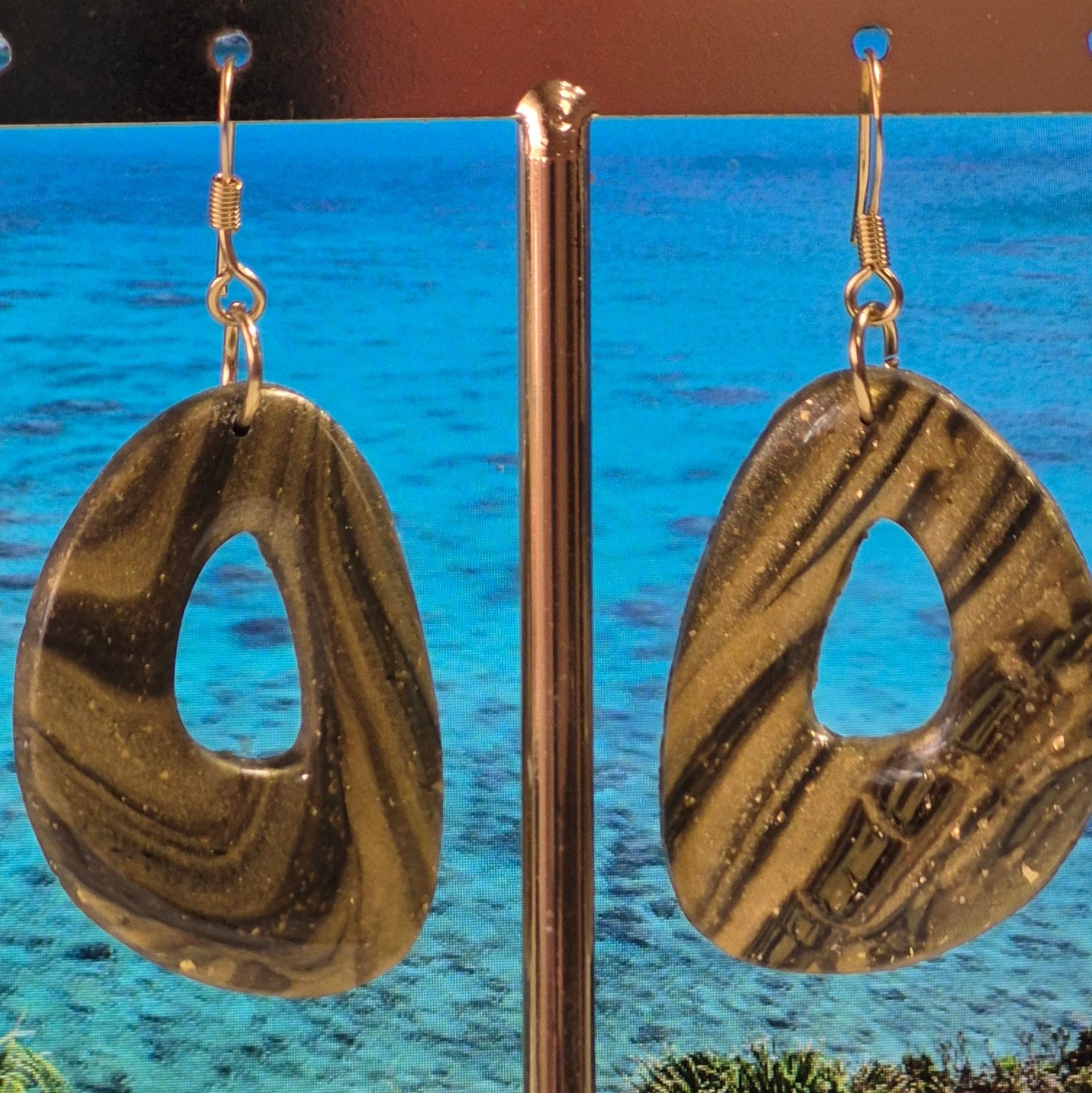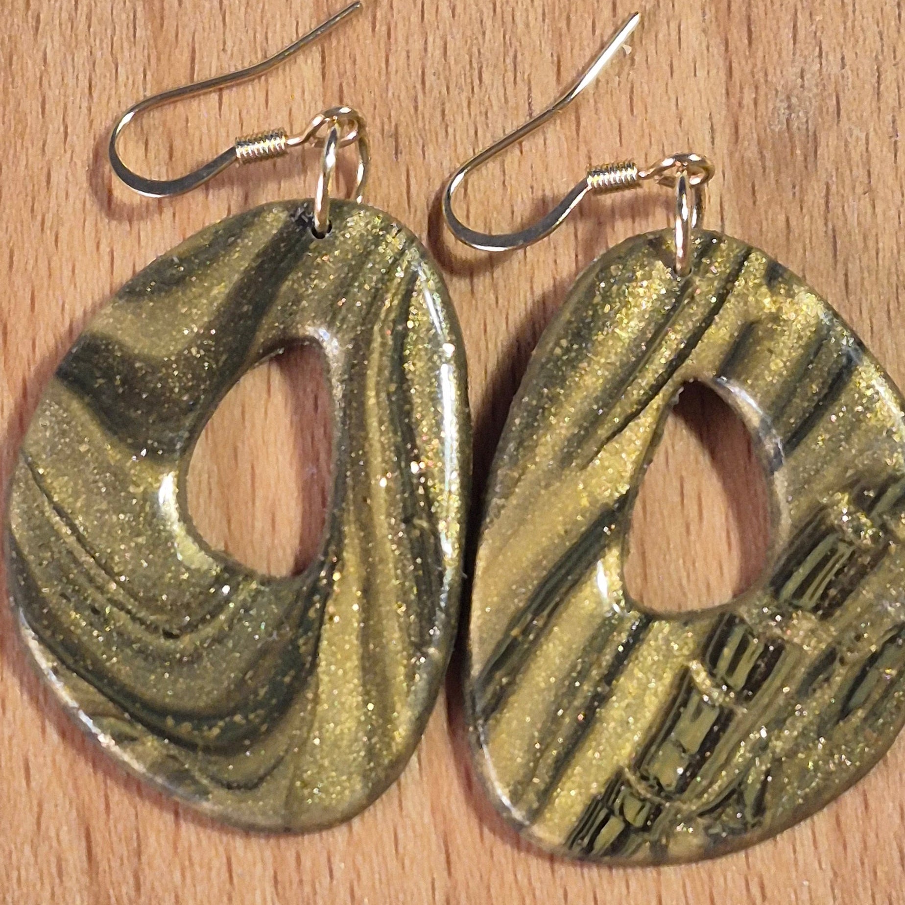 Pendientes hechos a mano en arcilla polimérica, con un diseño geométrico y un hueco interior orgánico que aporta ligereza y movimiento.