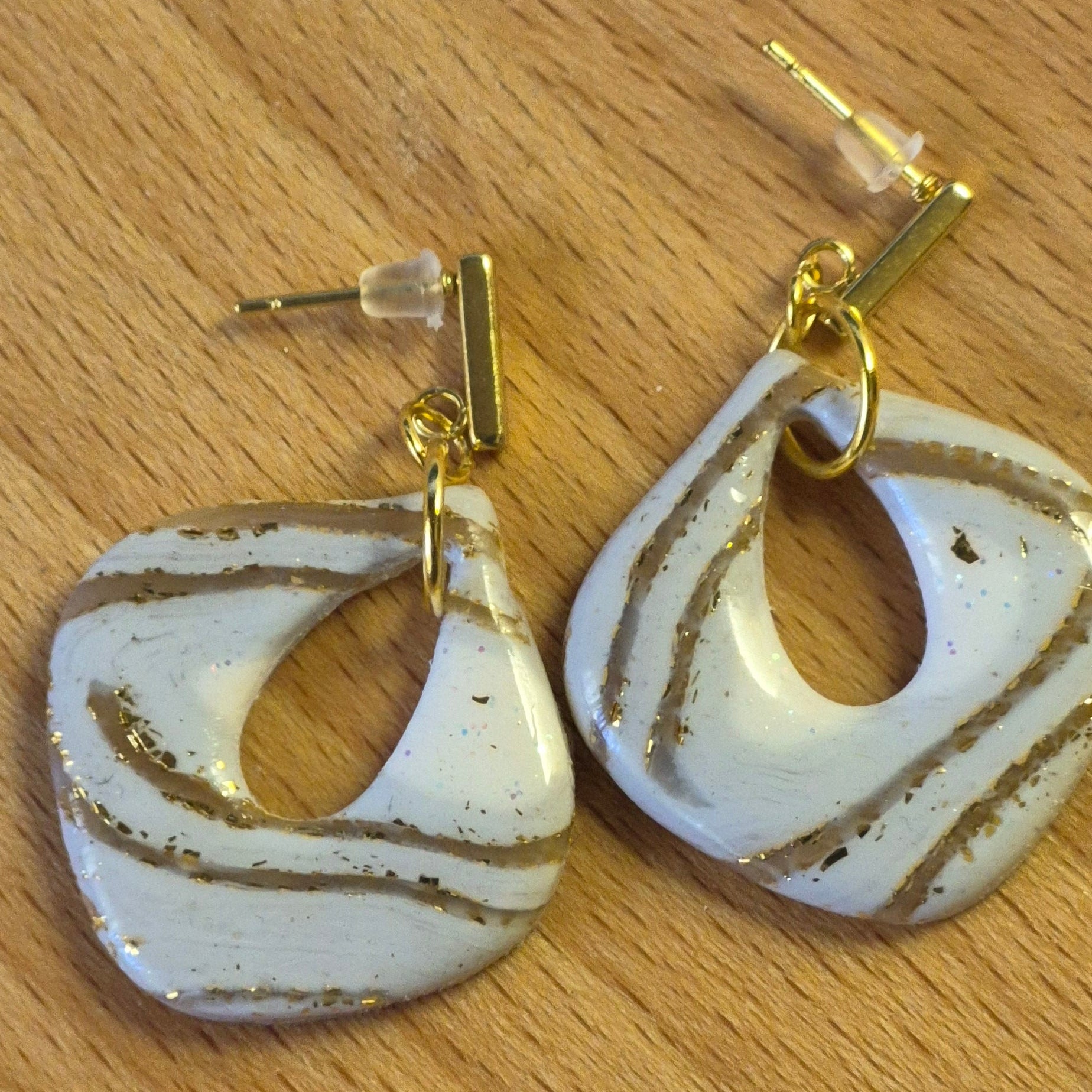 Hechos a mano en arcilla polimérica, presentan una forma orgánica y elegante con vetas doradas que recuerdan al reflejo del sol sobre las olas. Su acabado brillante y su ligereza los convierten en el accesorio ideal para cualquier ocasión, del día a la noche.