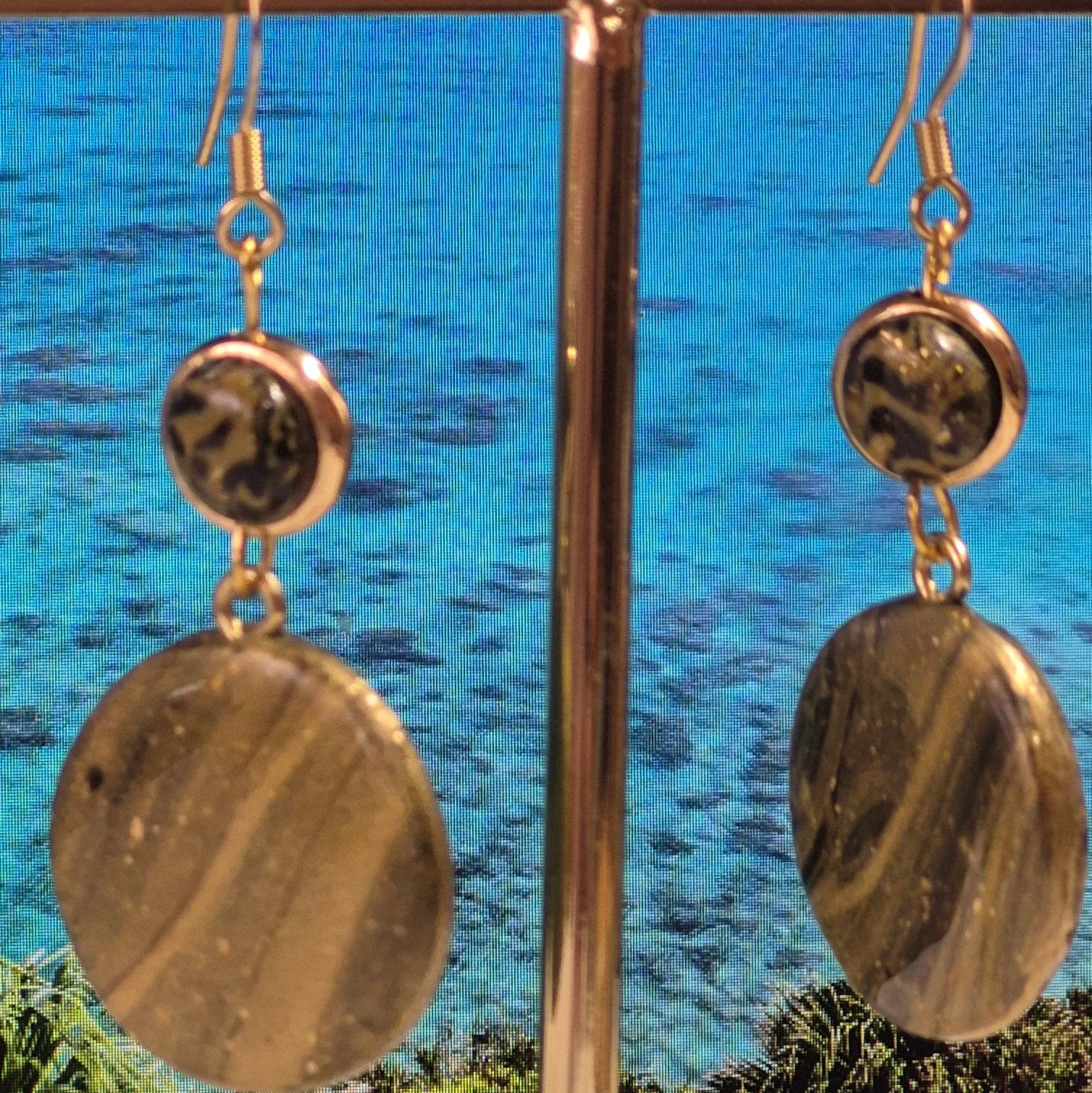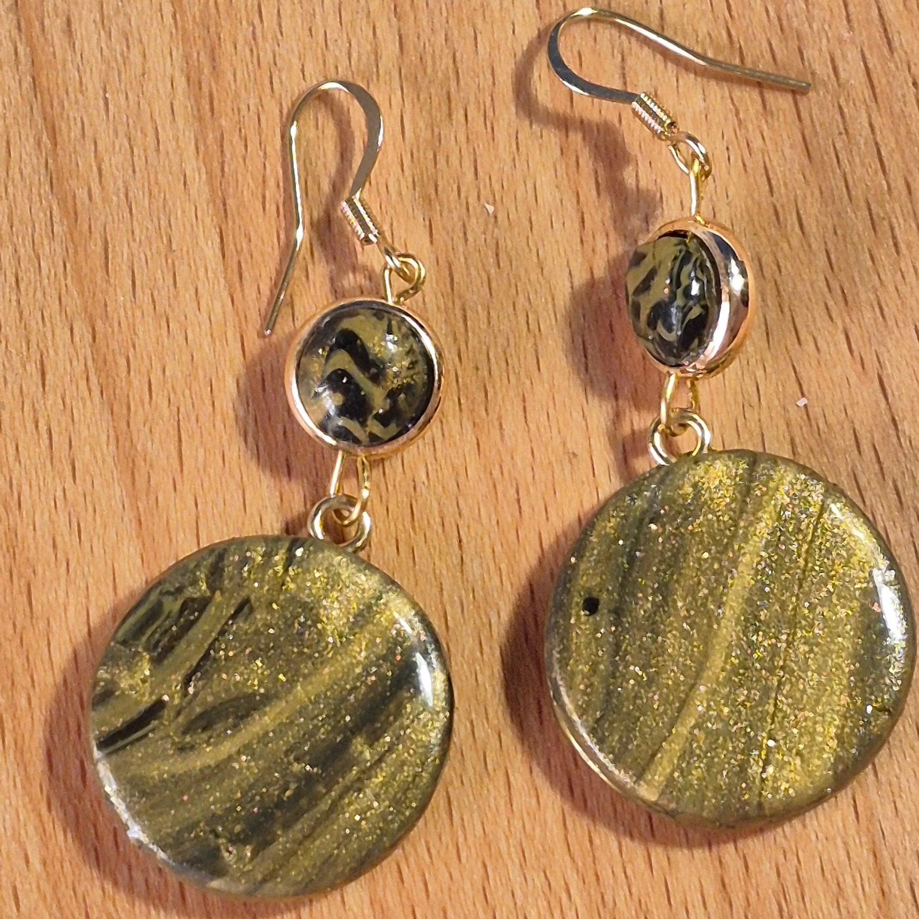 Pendientes hechos a mano en arcilla polimérica con bases y ganchos de acero inoxidable. Su diseño combina tonos dorados y vetas suaves que reflejan la calidez y el brillo de la miel bajo la luz del sol.