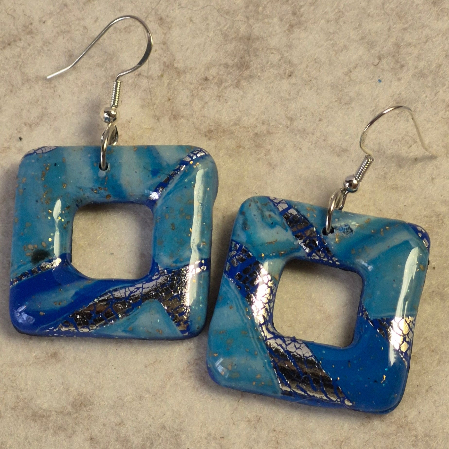 Estos pendientes únicos de arcilla polimérica en forma de cuadro hueco evocan la serenidad y el movimiento del océano con sus tonos azules vibrantes y vetas doradas. Cada pieza es hecha a mano, con un diseño artesanal que combina elegancia y originalidad. Ligeros, cómodos de llevar, y perfectos para aportar un toque artístico a cualquier look.