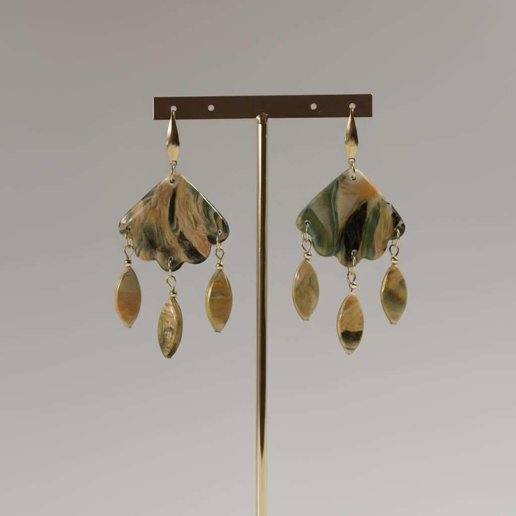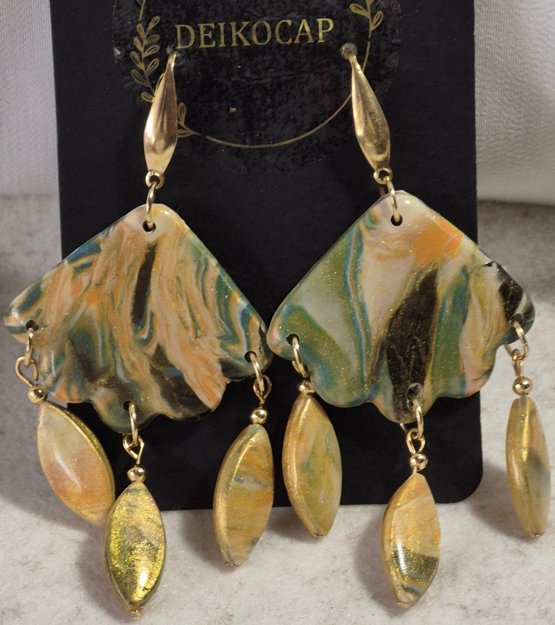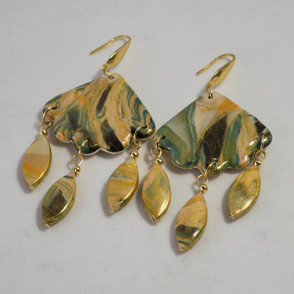 Hechos a mano en arcilla polimérica, presentan un elegante diseño marmoleado en tonos verde, dorado y melocotón, con un acabado brillante y detalles metálicos que capturan la luz con cada movimiento.