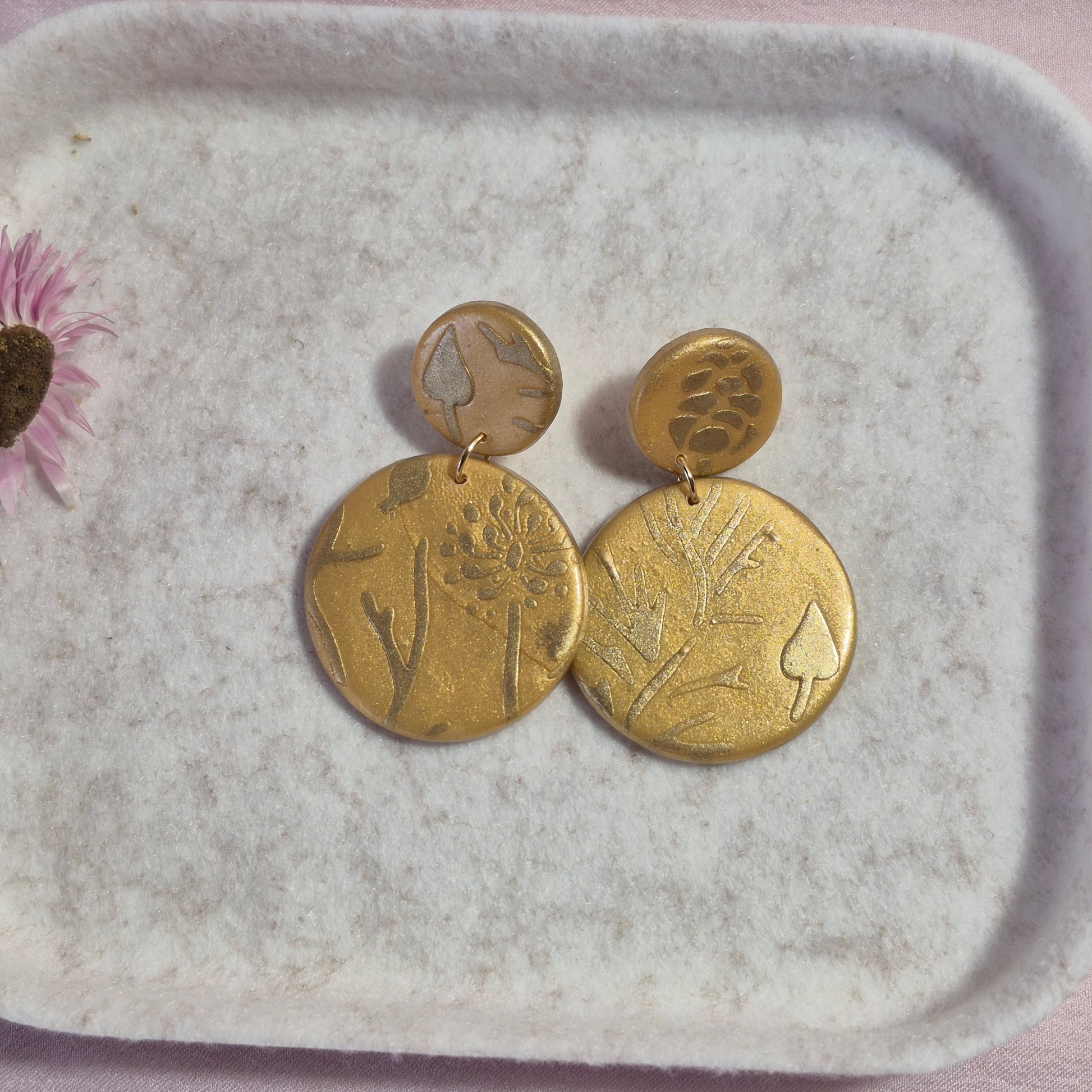 Pendientes hechos a mano con arcilla polimérica en un tono dorado suave y cómodo. Cada pieza está grabada con delicados motivos de hojas, flores y ramas que evocan la tranquilidad y riqueza visual de un bosque en calma. Su forma redonda simboliza la conexión cíclica con la naturaleza.