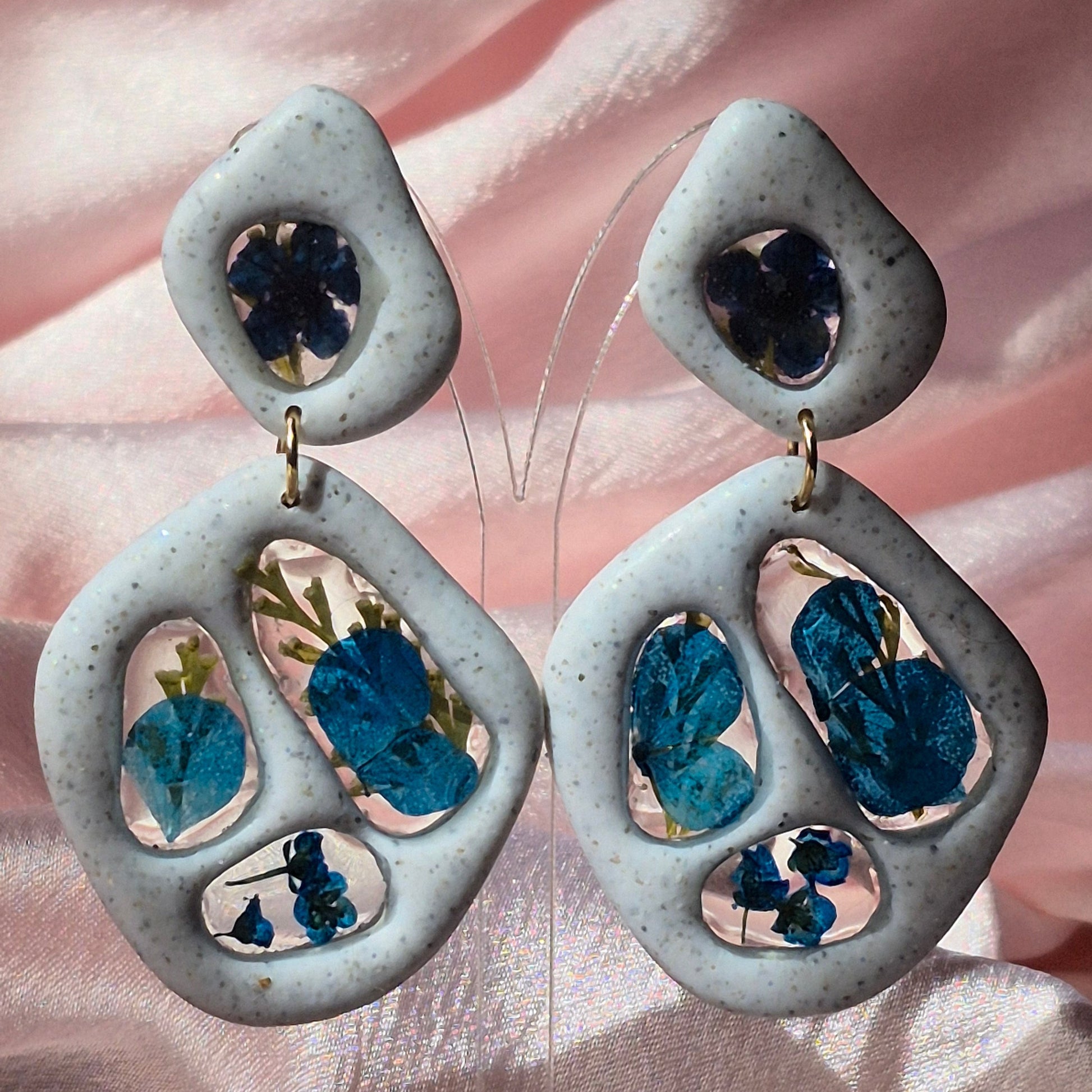 Pendientes hechos a mano con arcilla polimérica, pétalos naturales y un diseño fluido que evoca la armonía entre tierra y agua.