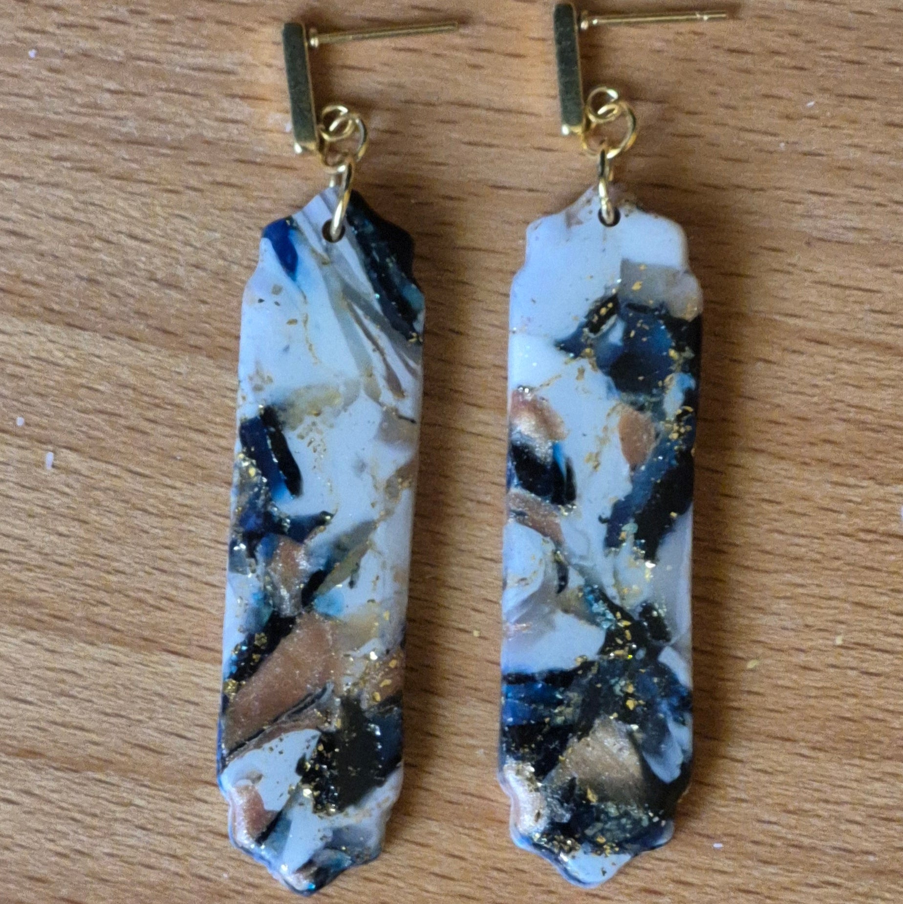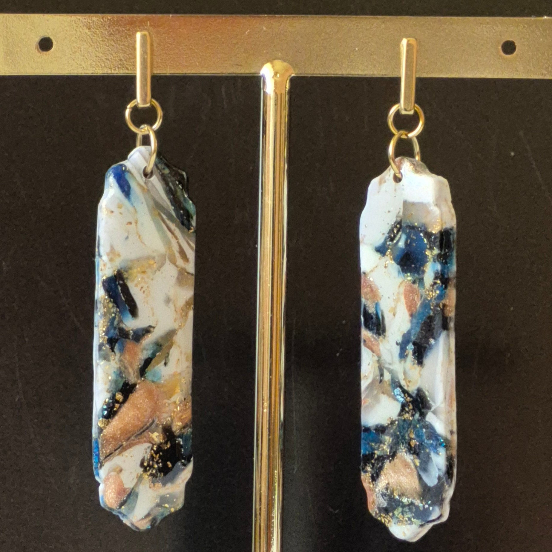 Pendientes largos hechos a mano en arcilla polimérica con detalles marmoleados en tonos blanco, negro, azul y destellos dorados. Su forma alargada estiliza y aporta un aire elegante, mientras que el efecto salvaje de la colección Safari los convierte en el complemento ideal para quienes buscan destacar con un toque único y cómodo. ✨