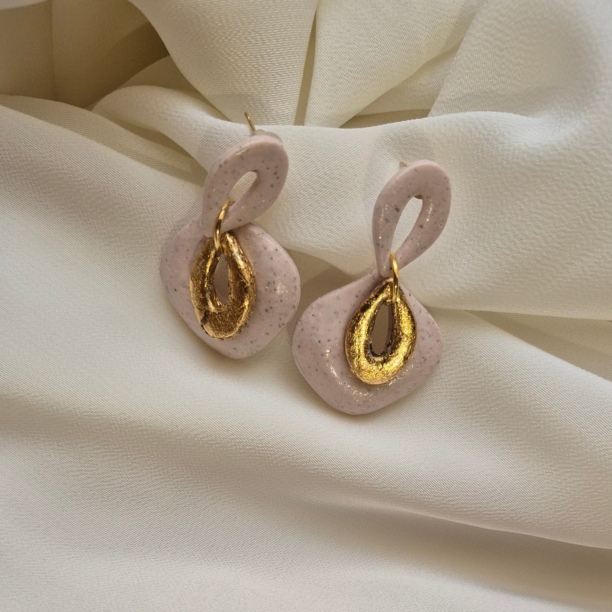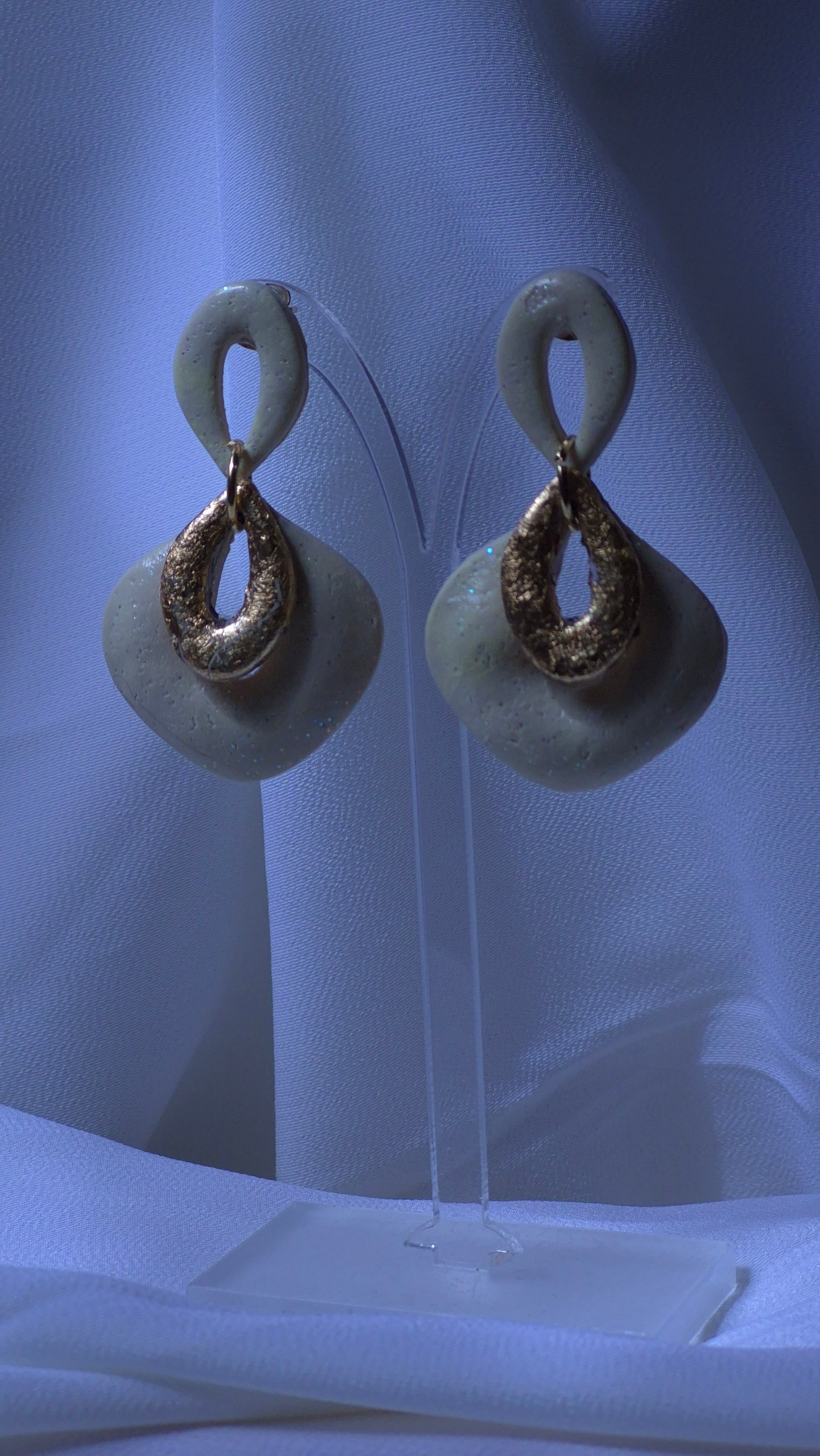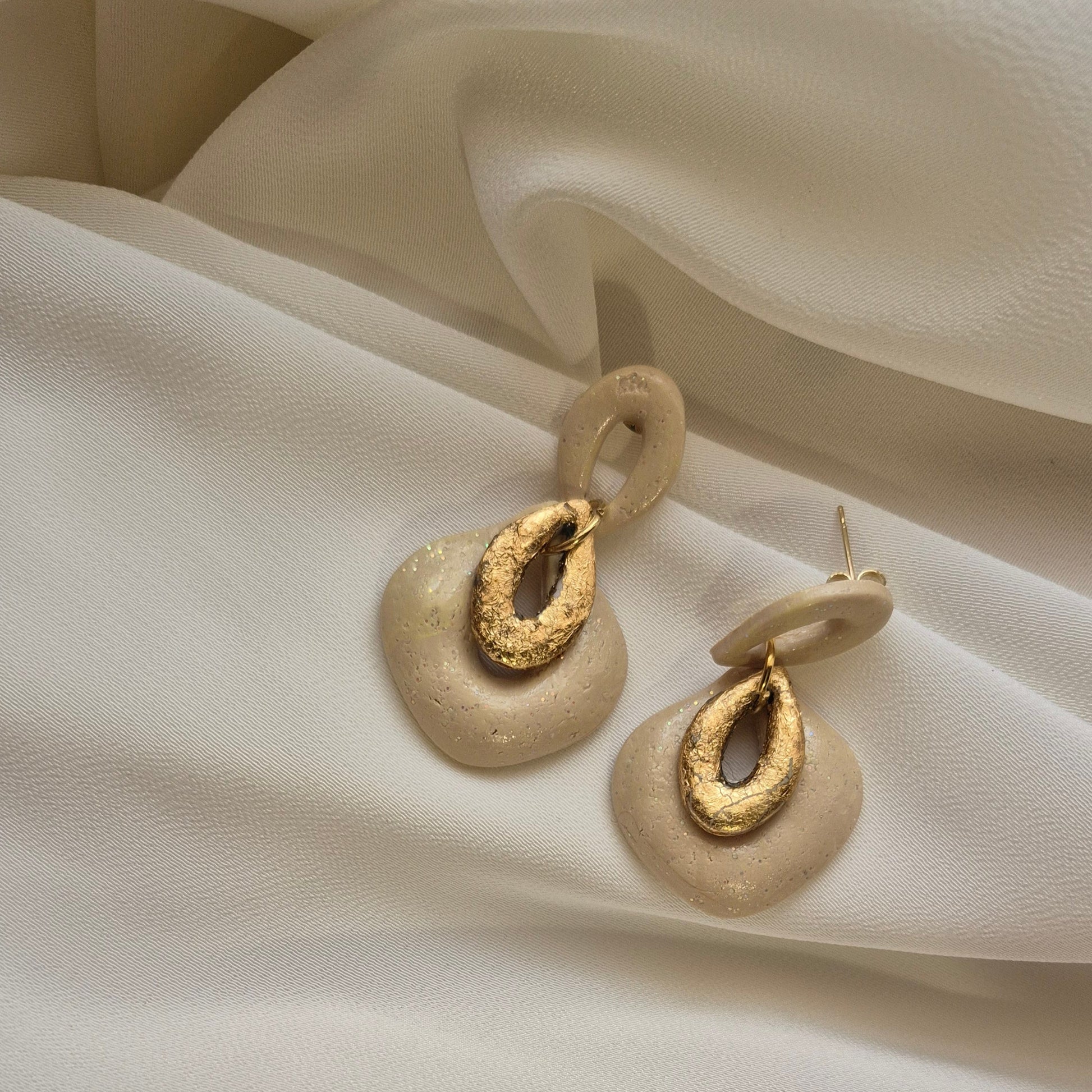 Pendientes elaborados en arcilla polimérica con un diseño abstracto y moderno. La base en tono beige con destellos sutiles se complementa con un elegante detalle dorado en forma de aro colgante, añadiendo un toque sofisticado. Su estilo artístico y fluido los convierte en una pieza única, ideal para realzar cualquier look con un aire contemporáneo y refinado.