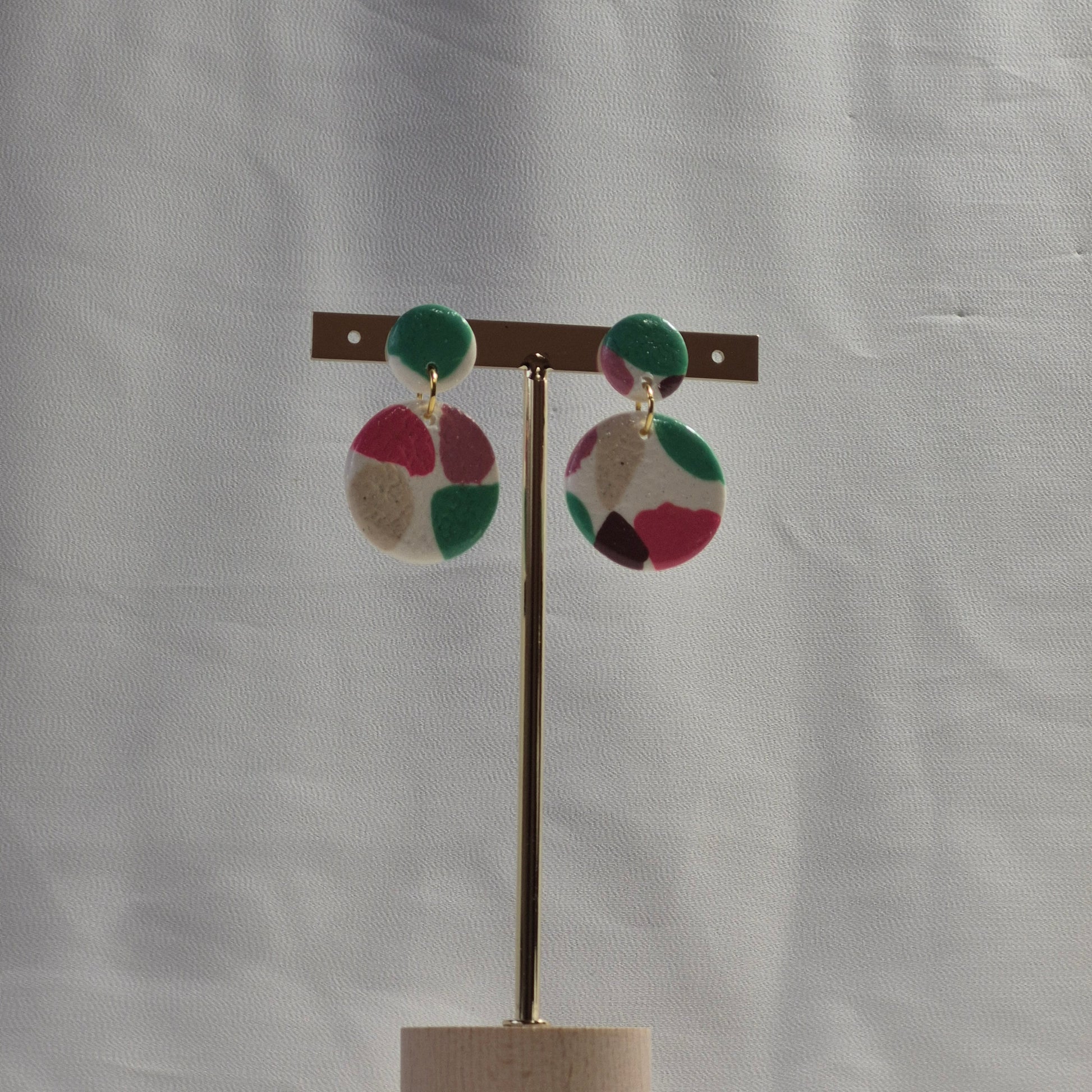 Estos encantadores aretes artesanales están hechos de arcilla polimérica y presentan un diseño redondo con un patrón tipo "confetti" en tonos pastel. Los colores predominantes son verde menta, rosa fucsia, beige, burdeos y blanco, creando un look alegre y artístico. La parte superior del arete es una pequeña pieza redonda con un diseño bicolor, unida a la pieza colgante más grande mediante una argolla dorada. Ligeros y cómodos, estos aretes son ideales para añadir un toque de color a cualquier atuendo casual o primaveral.