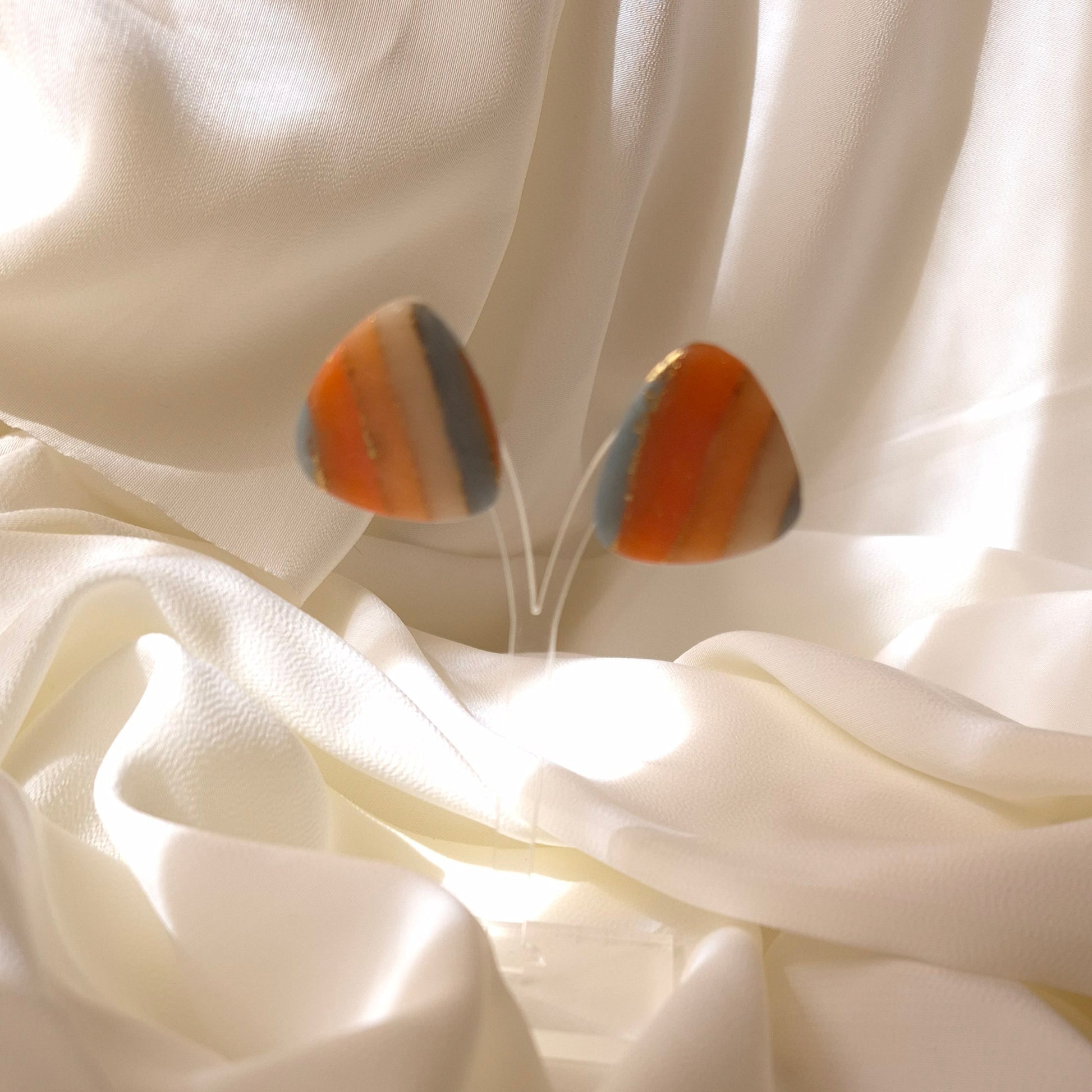 Hermosos aretes en forma triangular, elaborados en arcilla polimérica con un diseño de franjas en tonos naranja, beige y azul, acentuados con delicados detalles en pan de oro. Su combinación de colores evoca la calidez de un atardecer y la elegancia de la tierra, convirtiéndolos en el accesorio perfecto para quienes buscan un toque artesanal y sofisticado en su estilo.